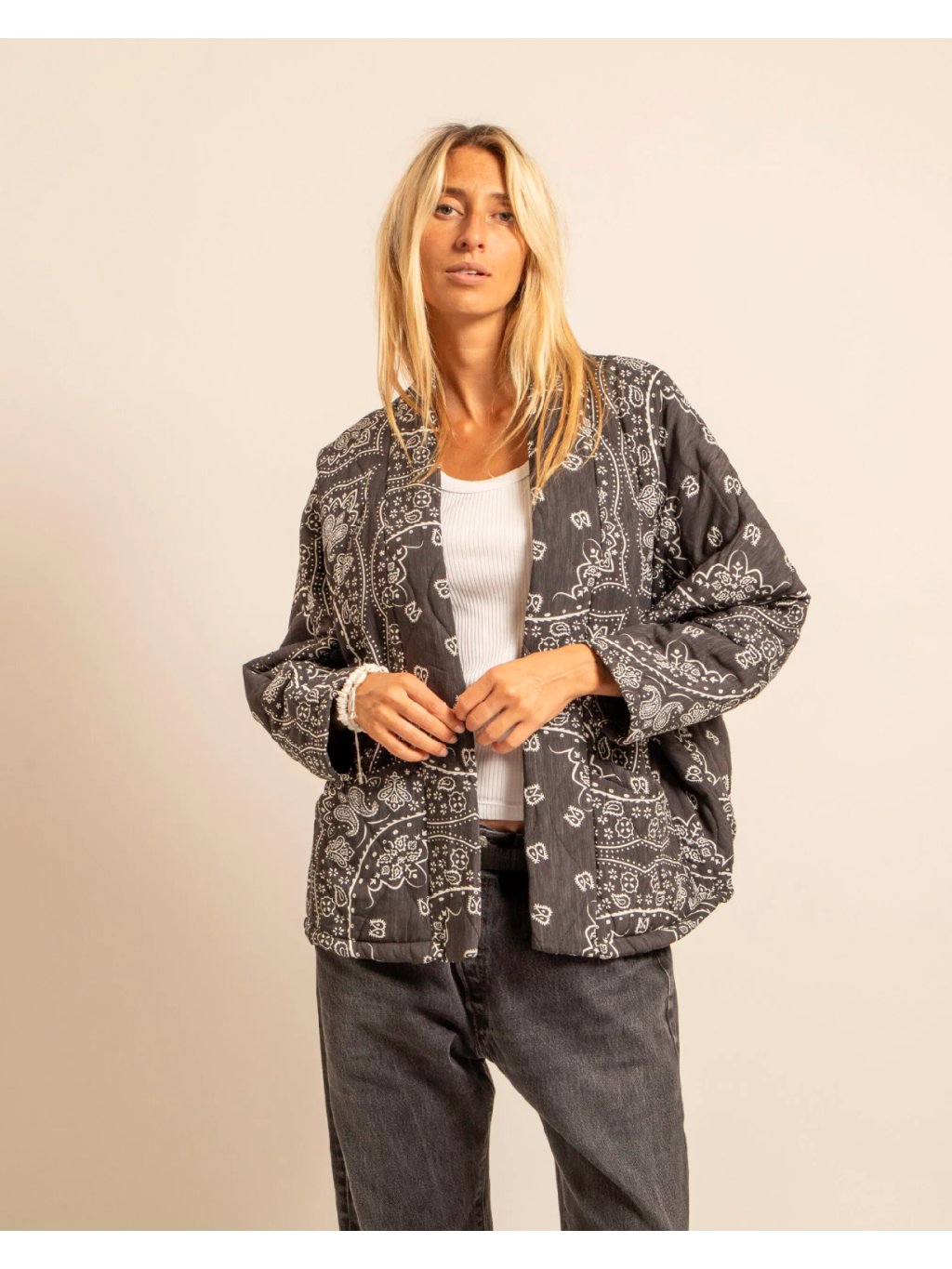 Lehká prošívaná bunda s výrazným bandana vzorem v tmavě šedém odstínu je kousek, který okamžitě dodá outfitu charakter. Volnější střih, měkký materiál a praktické kapsy z ní dělají ideální vrstvu pro každodenní nošení.