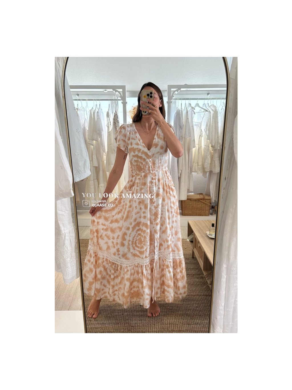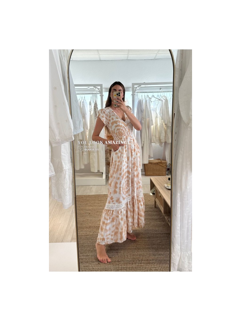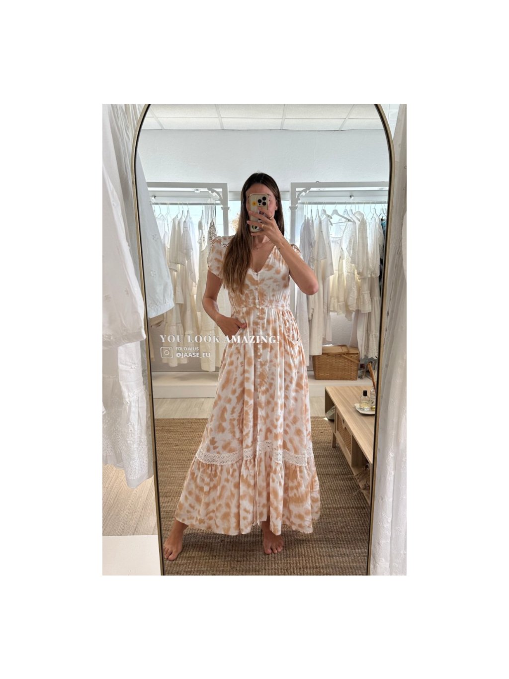 Tyto maxi šaty v bohémském duchu vynikají svým svěžím nádechem. Střih zůstává osvědčený – výstřih do „V“ s knoflíčkovou légou působí elegantně a prodlužuje krk, zatímco krátké rukávy dodávají modelu lehkost. Vysoký pas je žabičkovaný, díky čemuž se šaty krásně přizpůsobí postavě a jemně obepnou ženské křivky, čímž vytvářejí ladnou siluetu bez ztráty komfortu.