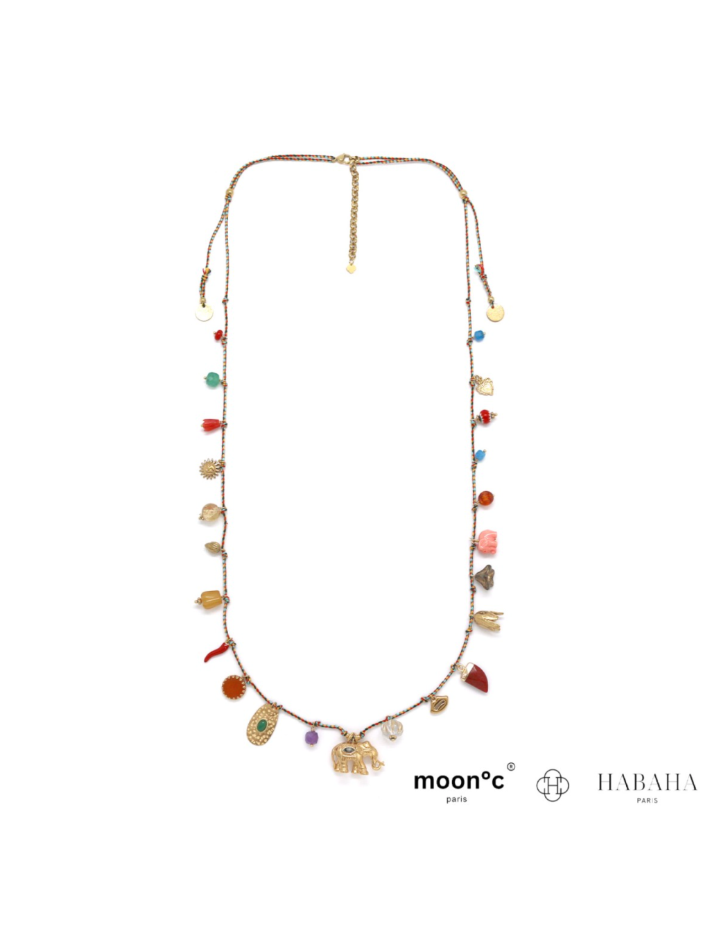 Jemná barevná šňůrka doplněná množstvím drobných přívěsků – symboly, kamínky i zlaté detaily – vytváří bohatý, ale lehce nositelný celek. Každý detail je jiný, a právě to dělá náhrdelník tak zajímavý.