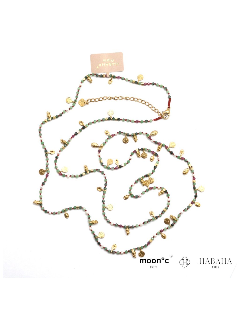 Habaha Paris – dlouhý náhrdelník s rubínem zoisitem a zlatými přívěsky