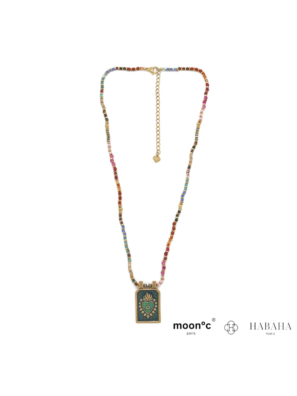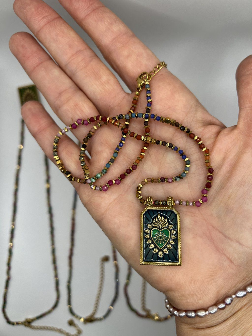 Dominantou je zdobený přívěsek se srdcem, inspirovaný symbolikou ochranných amuletů. Jemné detaily v kombinaci se sytými barvami dodávají šperku hloubku a osobitost. Barevný náhrdelník z drobných korálků krásně ladí s přívěskem a vytváří hravý, ale zároveň elegantní celek.