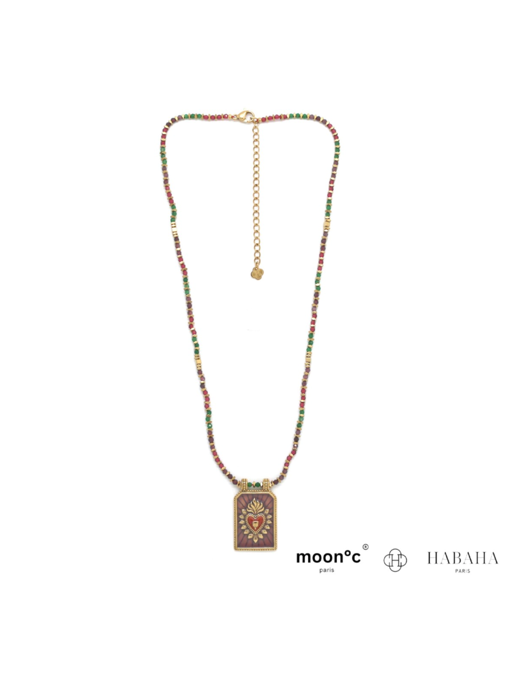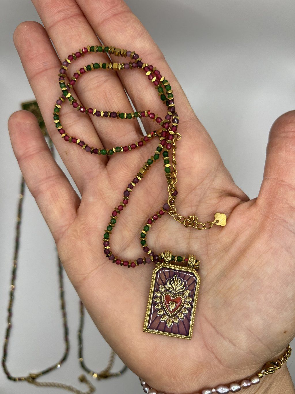 Dominantou je zdobený přívěsek se srdcem, inspirovaný symbolikou ochranných amuletů. Jemné detaily v kombinaci se sytými barvami dodávají šperku hloubku a osobitost. Barevný náhrdelník z drobných korálků krásně ladí s přívěskem a vytváří hravý, ale zároveň elegantní celek.
