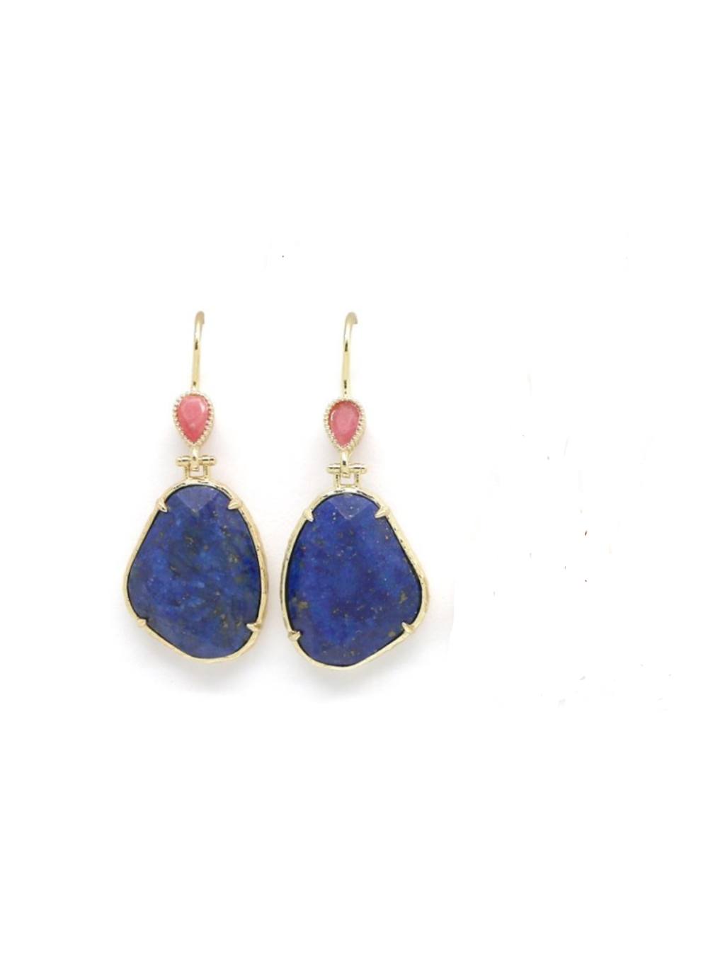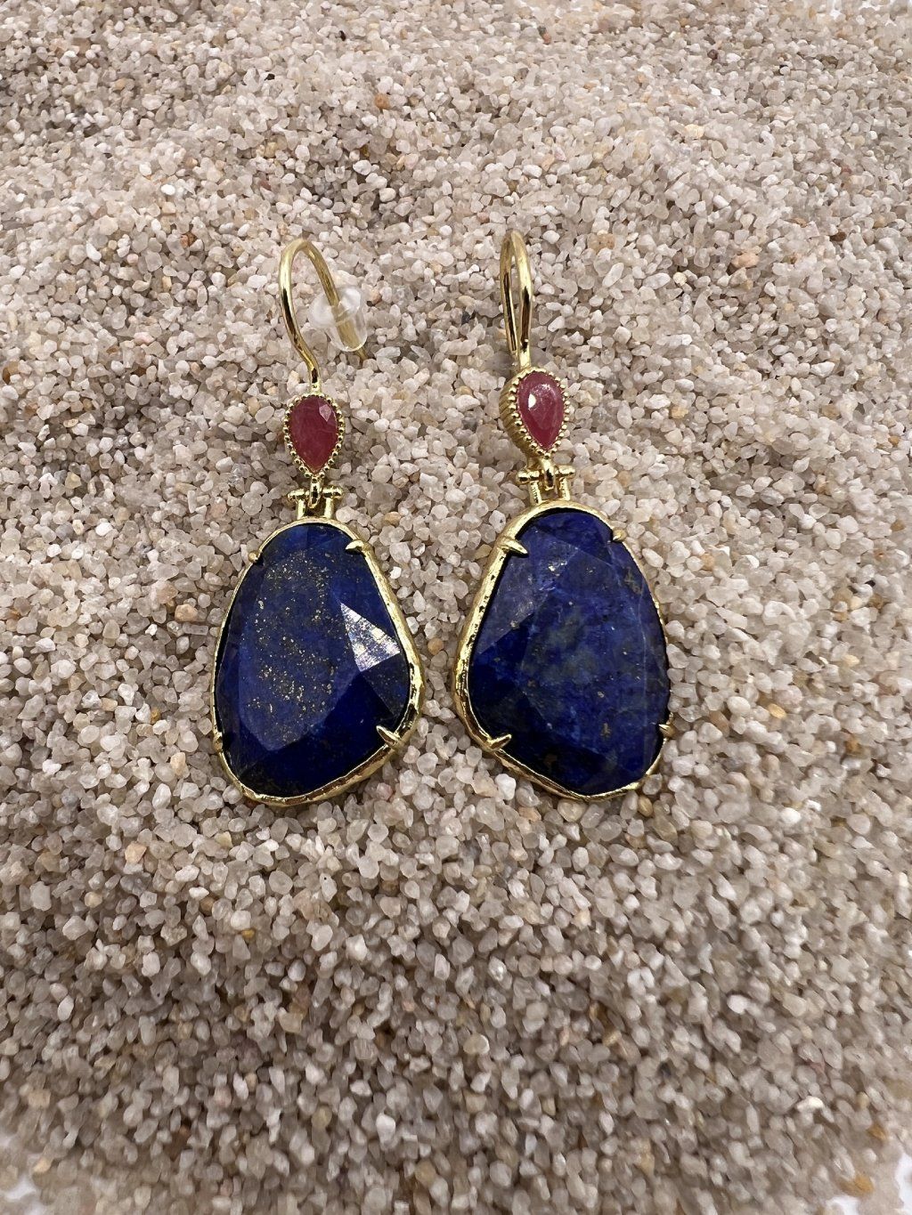 Dominantou náušnic je výrazný kámen lapis lazuli v hlubokém královsky modrém odstínu, jemně prokreslený zlatavými odlesky, které mu dodávají jedinečný charakter. Tento ikonický kámen působí klidně, ale zároveň nepřehlédnutelně. Nad hlavním kamenem je drobný detail v růžovém tónu, který vytváří jemný kontrast a dodává náušnicím ženskost a lehkost.