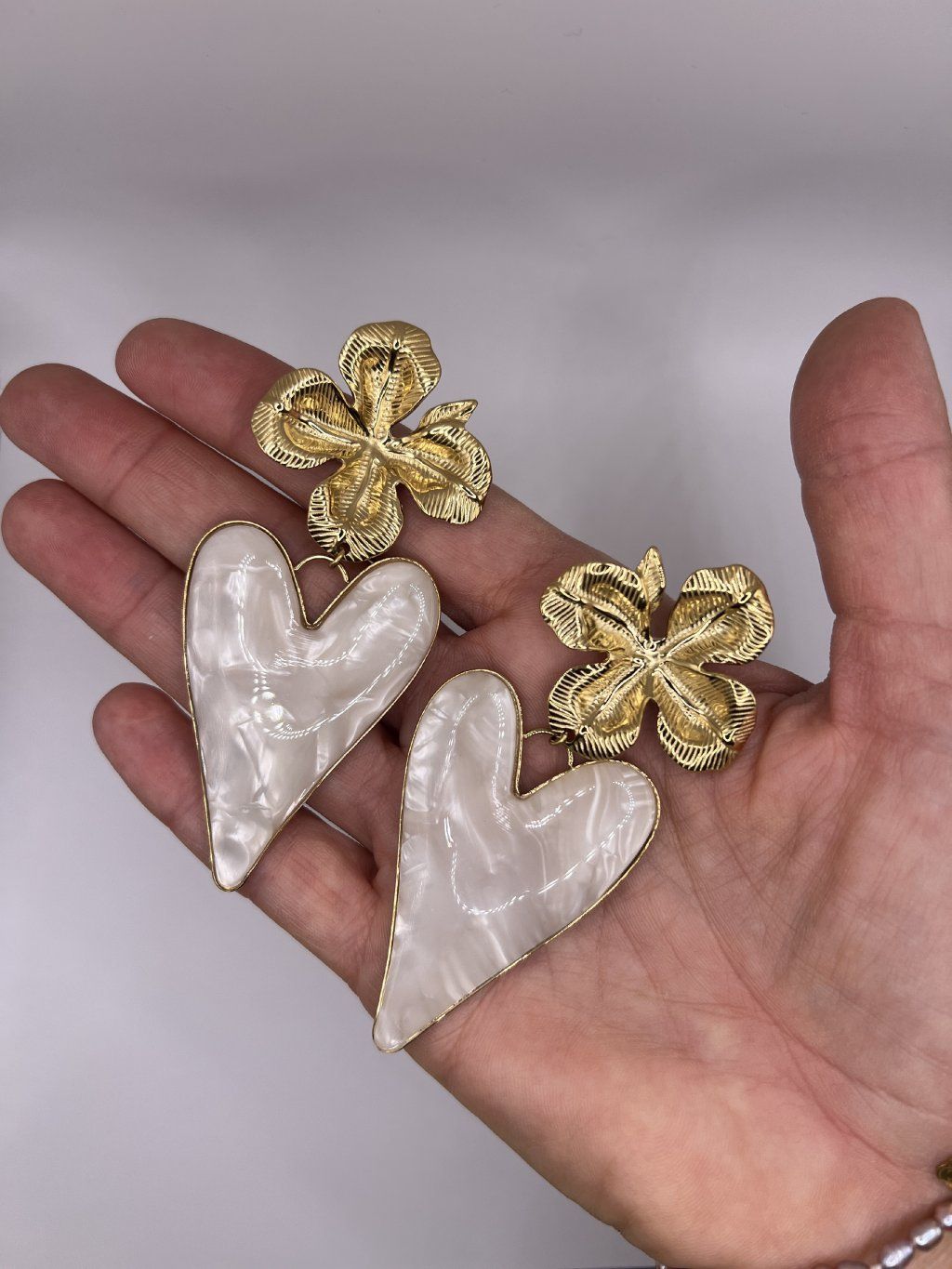 Dominantou náušnic je perleť ve tvaru srdce v krémově bílém odstínu, která se při pohybu jemně leskne a odráží světlo. Každý kus je originální díky přirozené kresbě perleti, což dodává šperku jedinečný charakter. Horní část ve tvaru stylizovaného květu působí jemně, ale zároveň dodává náušnicím výraz a osobitost.