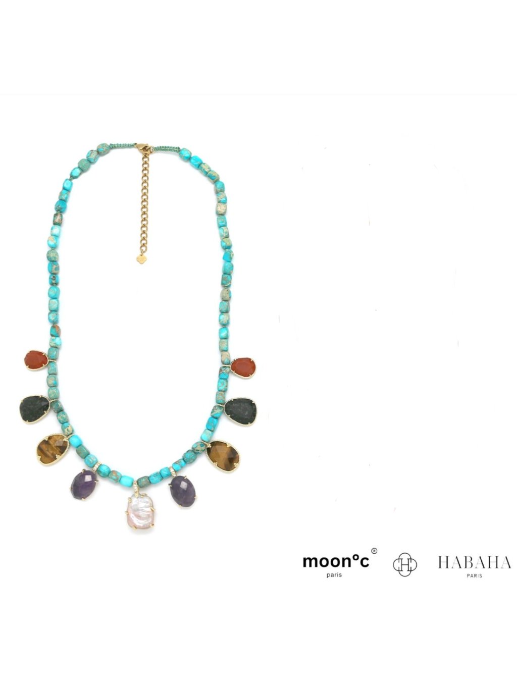 Výrazný, ale stále jemný náhrdelník z tyrkysových korálků doplněný o přívěsky z přírodních kamenů a krásnou říční perlou uprostřed. Každý kámen má svou jedinečnou kresbu a barvu, což dává šperku osobitý a bohémský charakter.