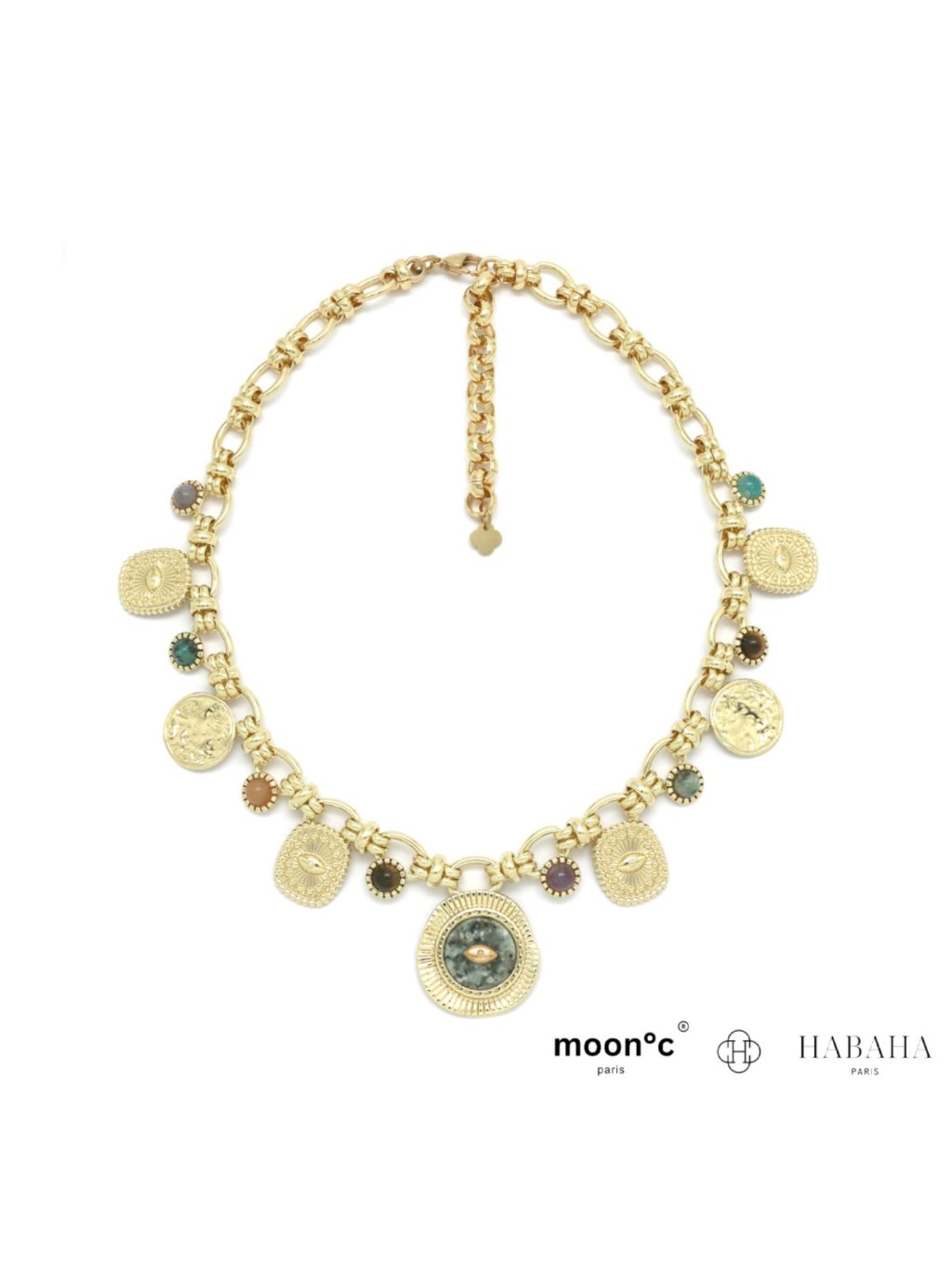 Náhrdelník je tvořen elegantním oválným řetízkem ve zlatém tónu, na kterém jsou zavěšeny dekorativní mincové přívěsky a drobné kameny v různých barvách. Dominantou šperku je výrazný přívěsek s africkým tyrkysem, doplněný jemným motivem oka, který dodává náhrdelníku mystický a symbolický charakter.