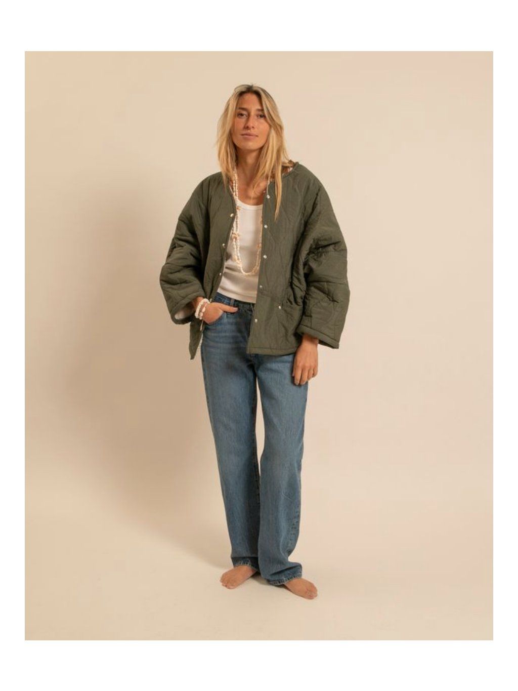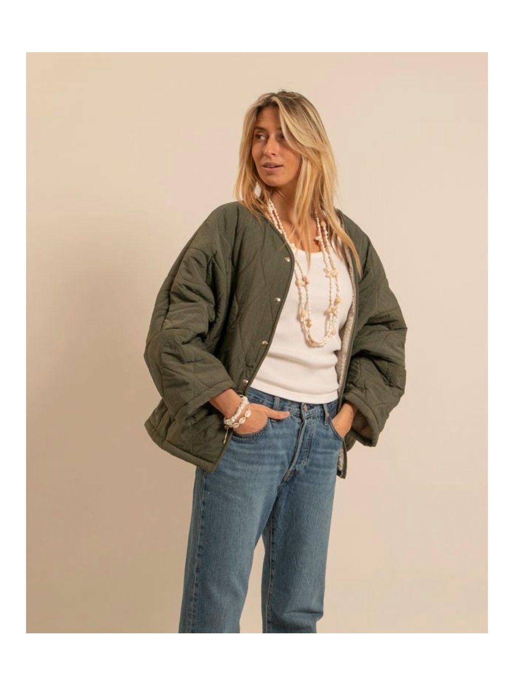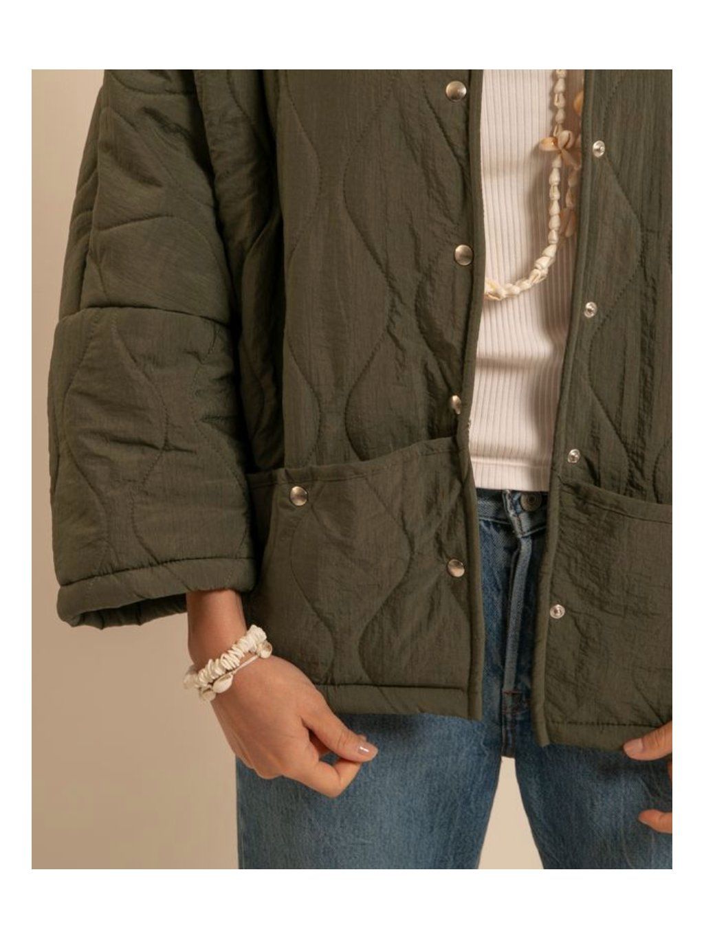 Stylová prošívaná bunda s hebkým vnitřním kožíškem, která spojuje pohodlí, hřejivost a minimalistický design. Lehká, ale přitom příjemně teplá – ideální pro přechodné období a chladnější podzimní dny.