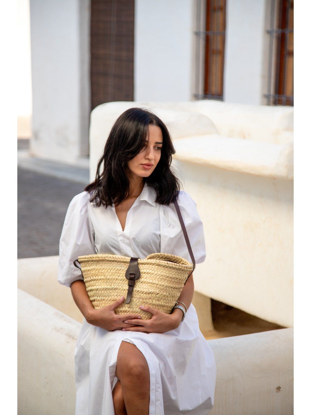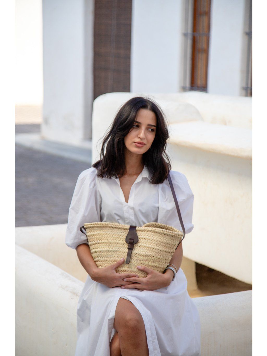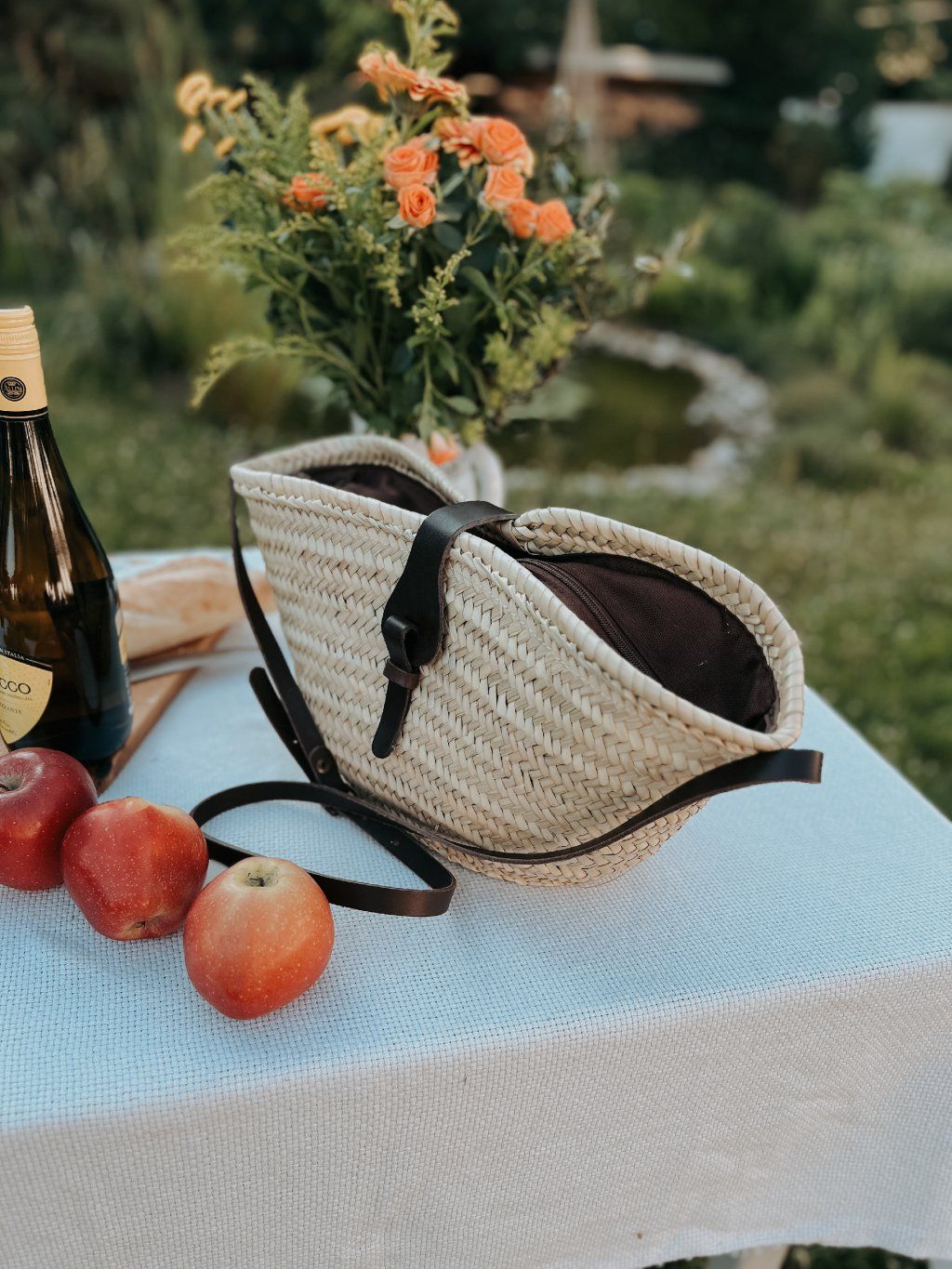 Středně velká proutěná taška z Mallorky – s koženým zapínáním a podšívkou