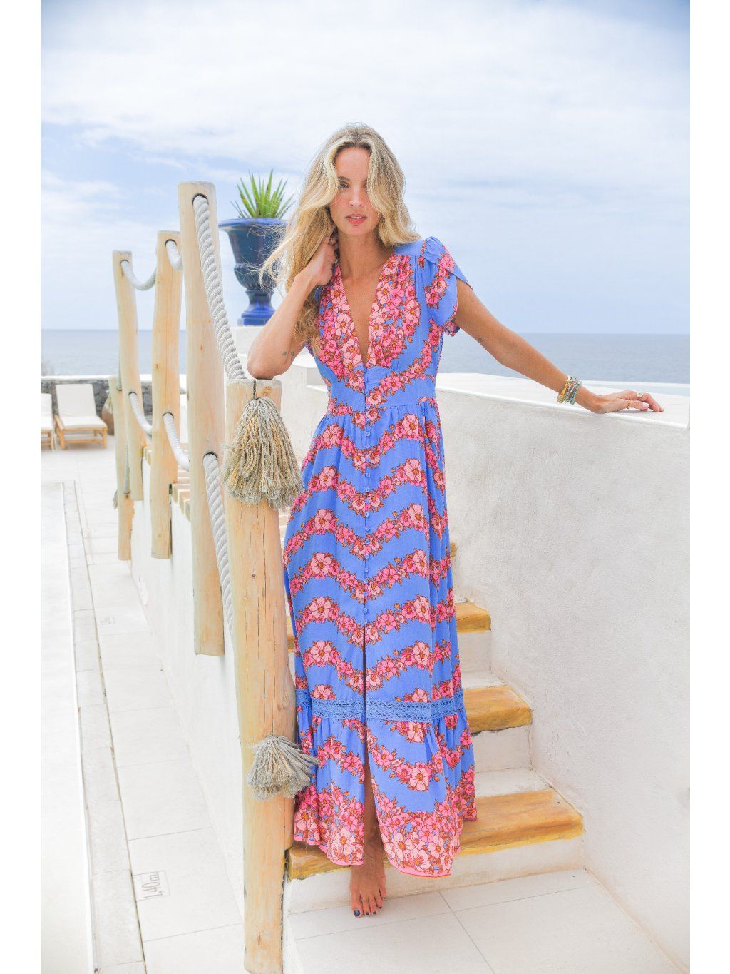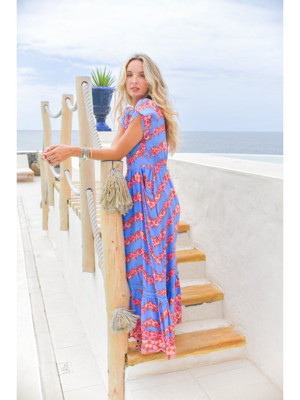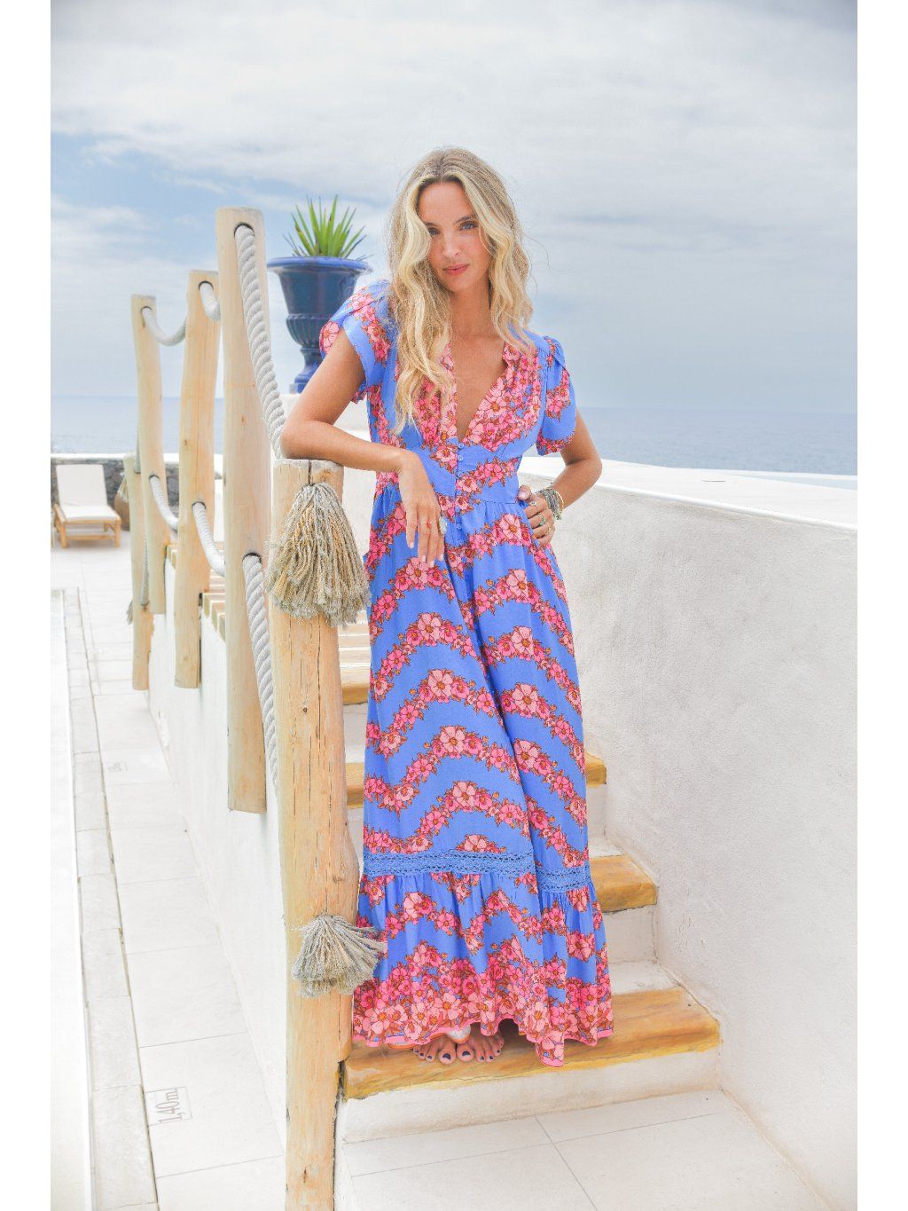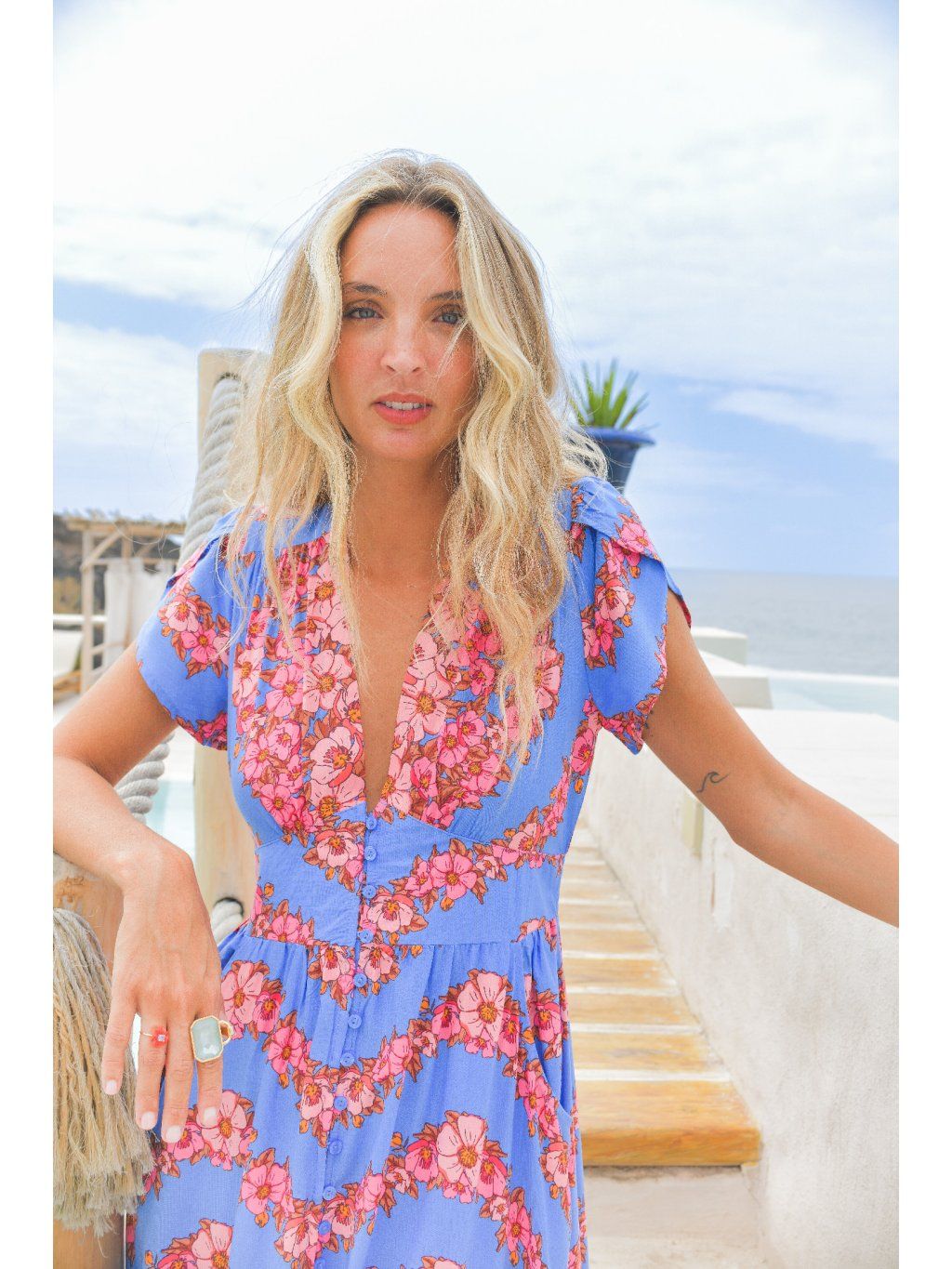 Barva je naprosto výjimečná – svěží modrá s růžovými květy, která na opálené pokožce doslova září. Přesně ty šaty, které si vezmeš na dovolenou, letní večeři nebo jen tak do dne, kdy chceš zazářit.