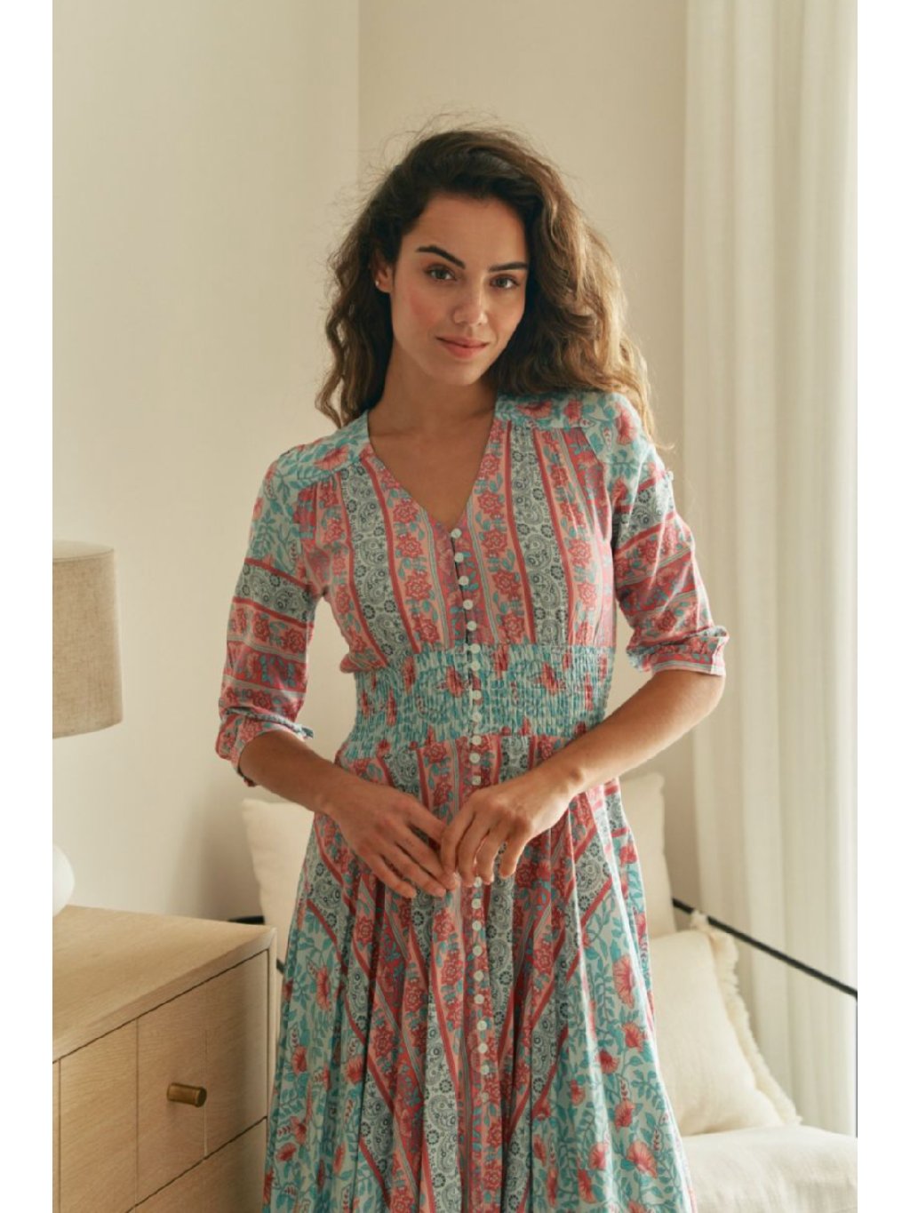 Šaty mají 3/4 rukávy a výstřih do V, který dodává outfitu šarm a jemnost. Díky nařasenému pásu krásně zvýrazní pas a opticky prodlouží nohy, což činí tyto šaty nejen pohodlnými, ale i velmi stylovými. Tento střih je navržen tak, aby vytvořil harmonickou siluetu a zdůraznil ženské křivky.