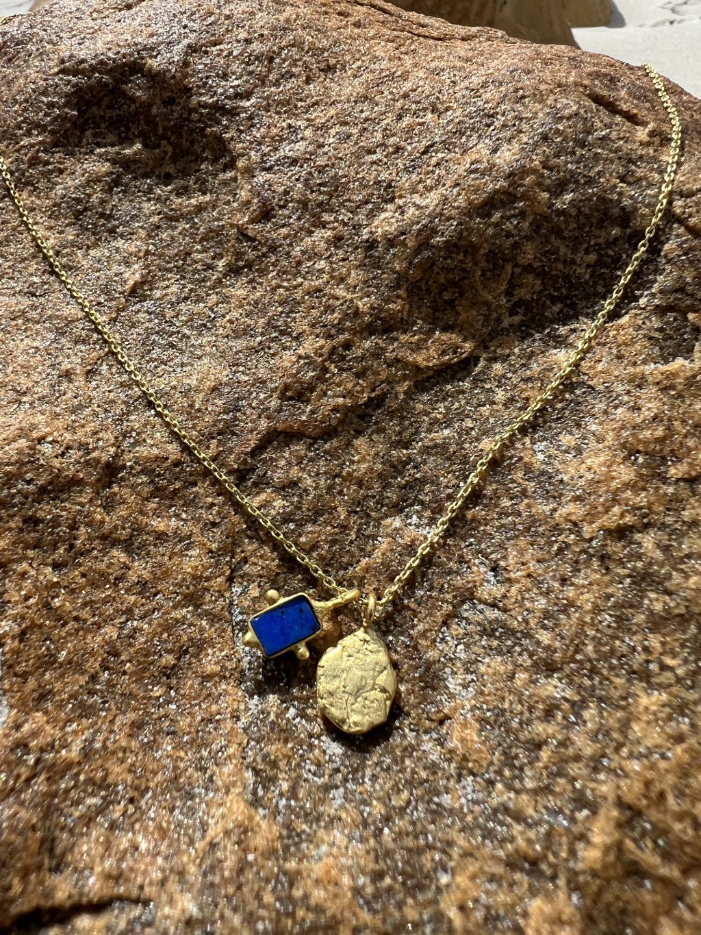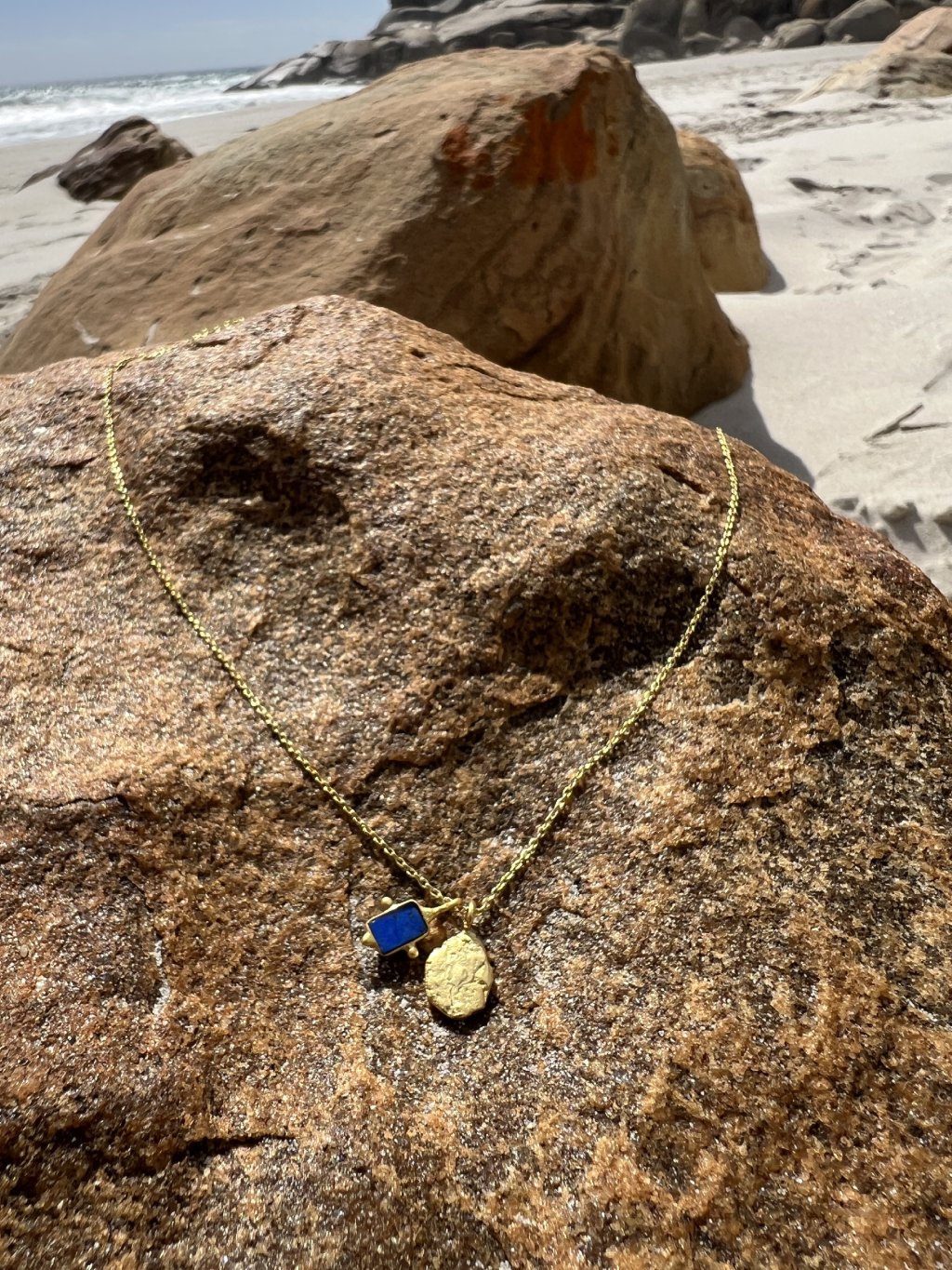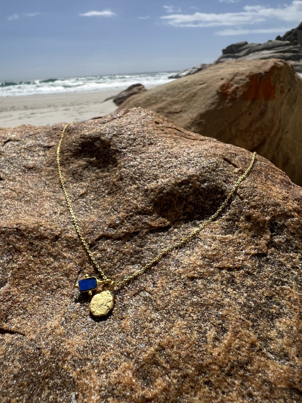 Jemný zlatý náhrdelník s modrým onyxem doplněný o strukturovaný medailonek. Spojení hluboké modré a teplého zlata vytváří harmonický talisman, který působí klidně, ale zároveň silně.
