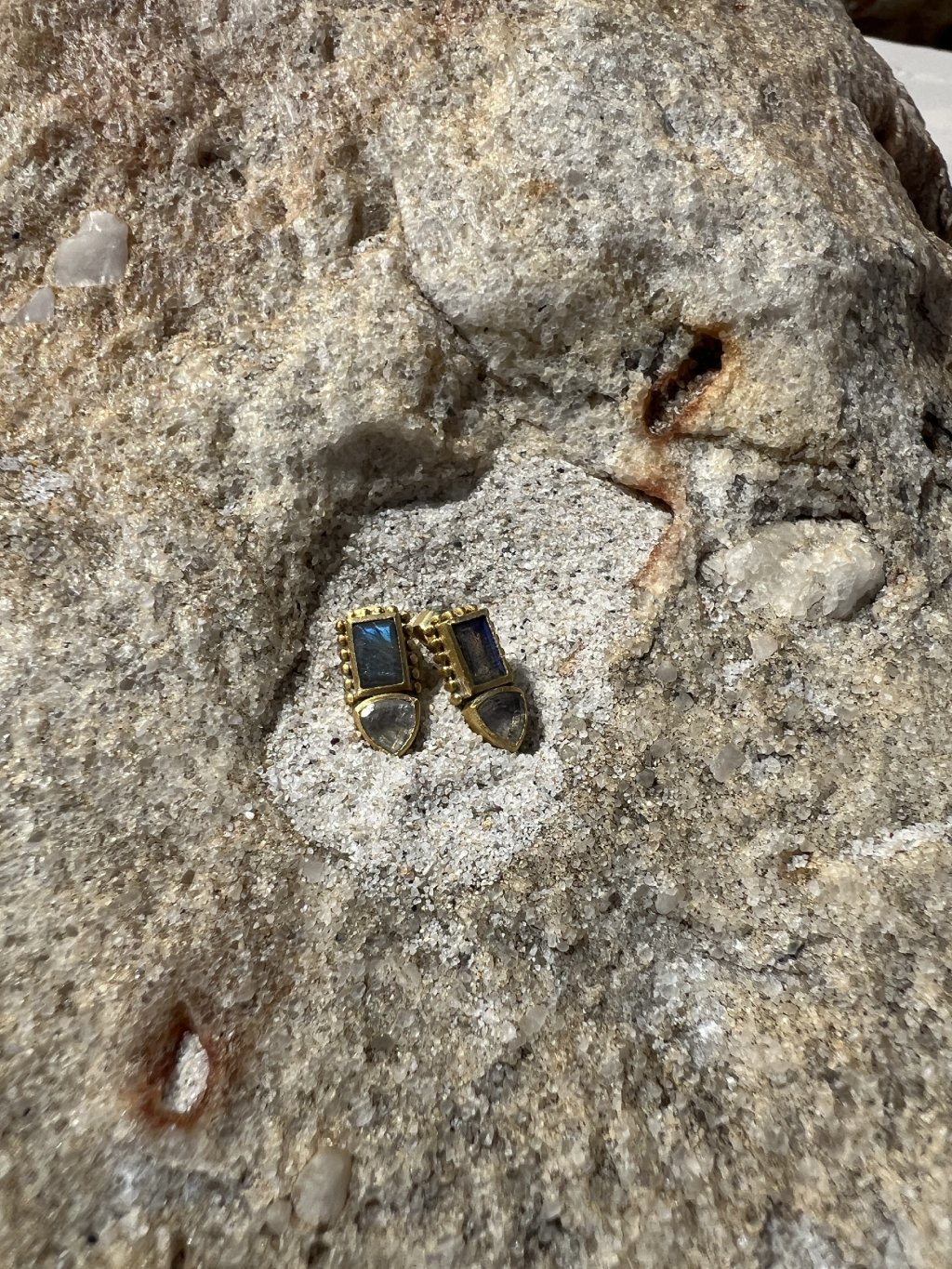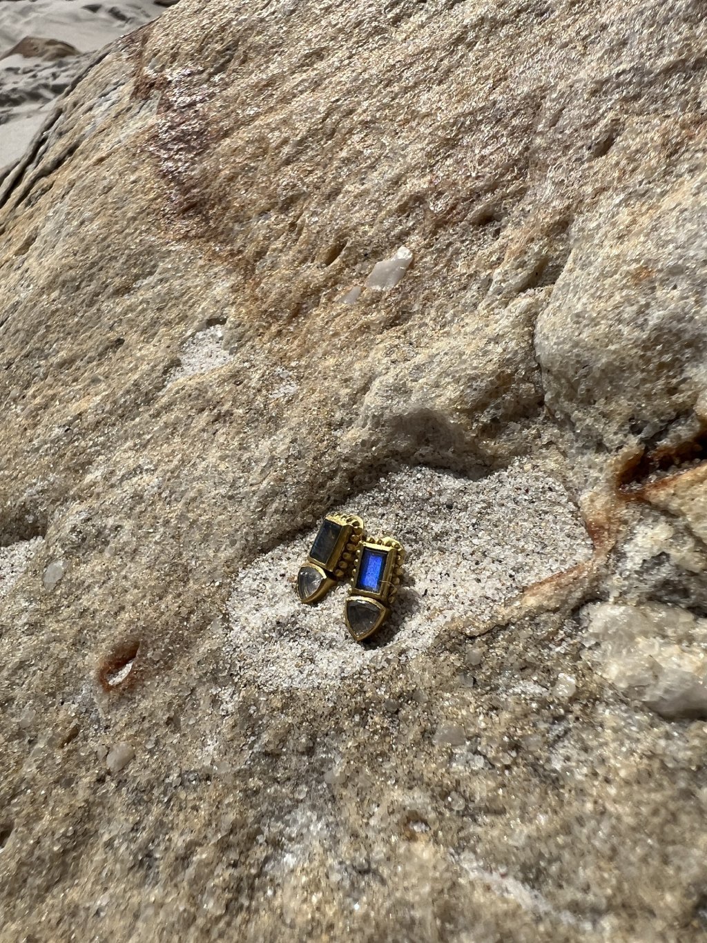 Kapkové náušnice s přírodním labradoritem zasazeným do jemného zlatého tónu. Minimalistický tvar nechává vyniknout přirozenou kresbu kamene a jeho typický magický odlesk.