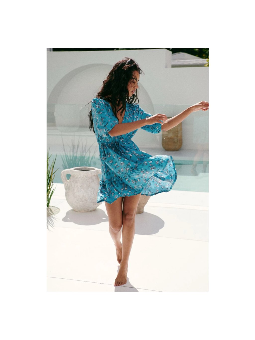 Tyto šaty jsou lehké, letní a velmi ženské. Mají sytě tyrkysově modrou barvu s jemným květinovým potiskem v odstínech bílé a růžové. Střih je volný a pohodlný, s výrazným hlubším výstřihem do „V“ a zavazováním v pase, které zvýrazňuje siluetu. Rukávy jsou tříčtvrteční, lehce nabírané a zakončené do volnější manžety, což působí vzdušně. Spodní část sukně je kratší, volánková a dodává šatům hravý a romantický nádech. Celkově jde o ideální model na léto – k bazénu, na dovolenou nebo na procházku u moře.