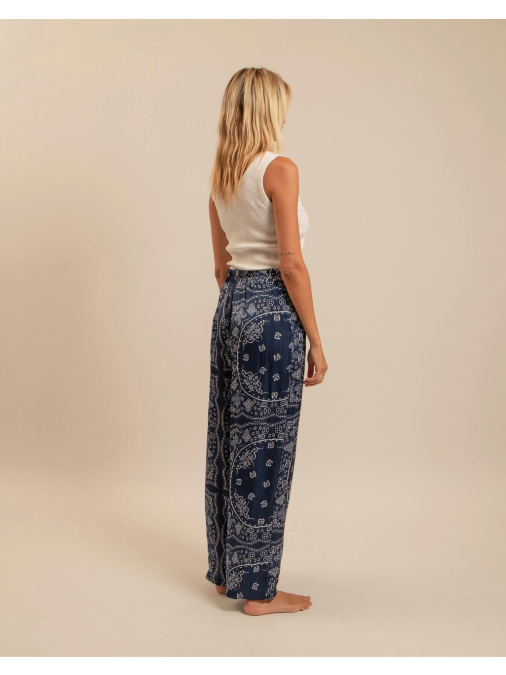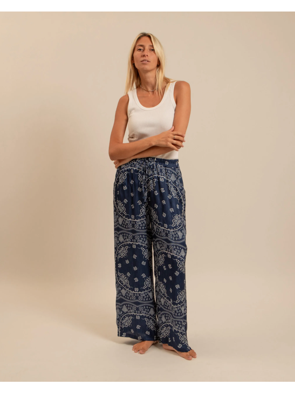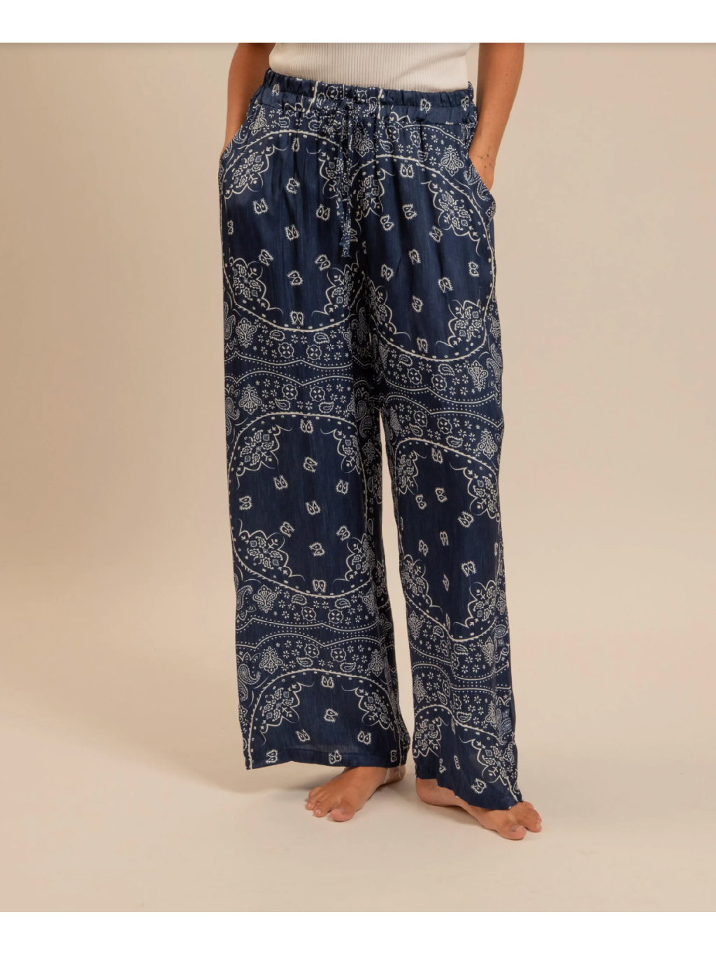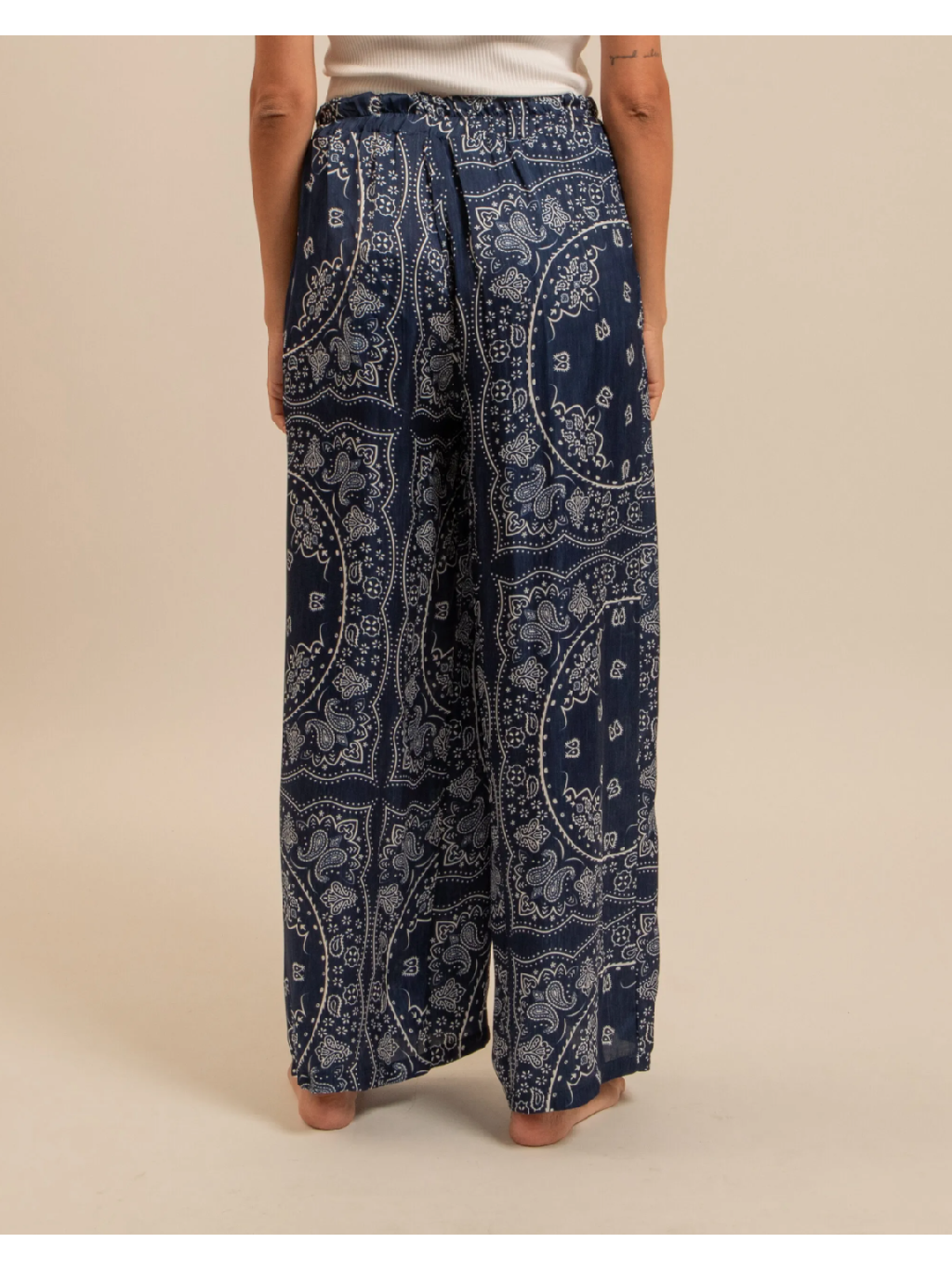 Bandana vzor v odstínu navy dodává modelu výraz, ale zároveň zůstává klidný a snadno kombinovatelný. Elastický pas se šňůrkou se přizpůsobí podle potřeby – pohodlí bez kompromisu.