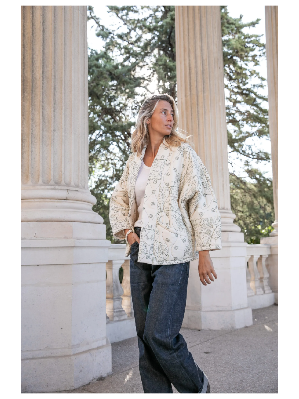 Má volnější střih, který krásně funguje při vrstvení. Můžeš ji nosit otevřenou jako lehkou vrstvu přes šaty nebo ji vzít jako přechodovou bundu do města. Právě v tom je její kouzlo – propojuje nenucený surf vibe s moderním, upraveným lookem.