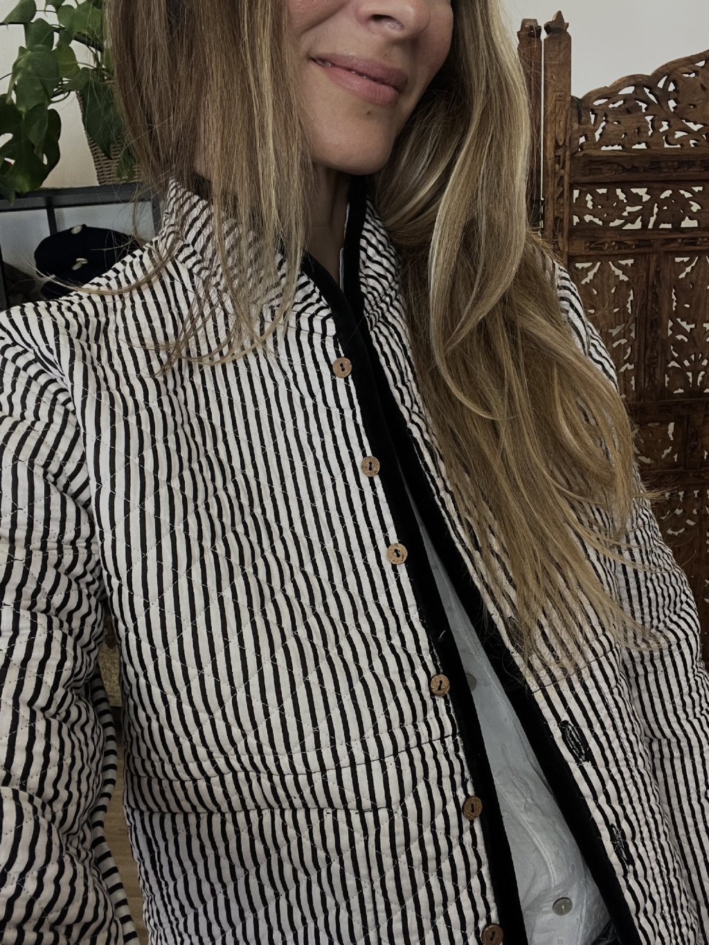 Z jedné strany jemný samet s kapsami, z druhé strany lehká bavlna s tenkým proužkem a dřevěnými knoflíčky. Kabátek je oboustranný, takže ho můžete nosit podle nálady – elegantně sametový, nebo uvolněně bavlněný.