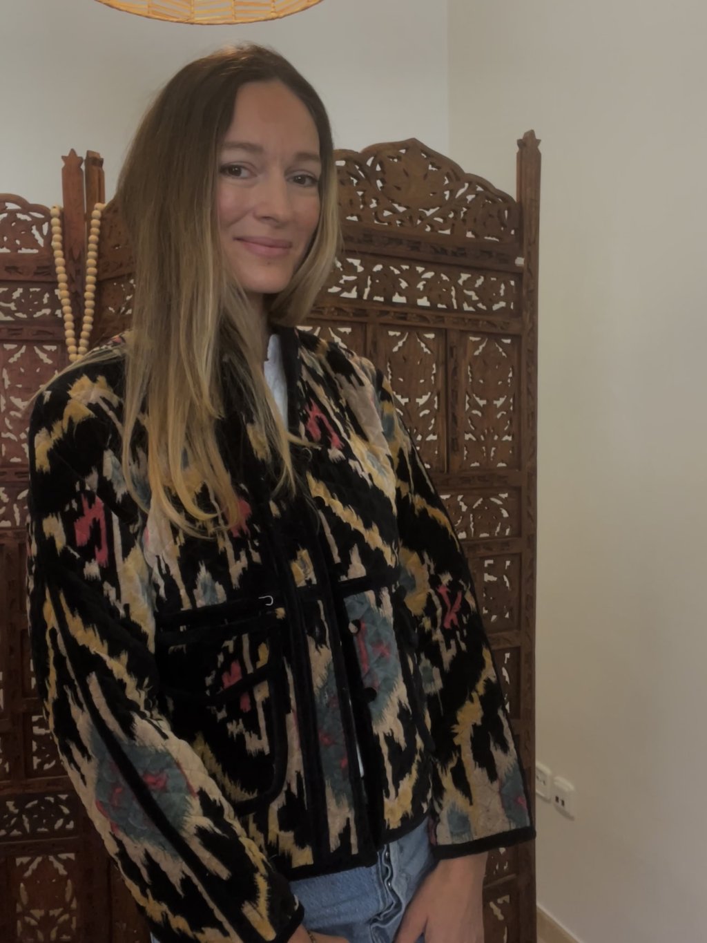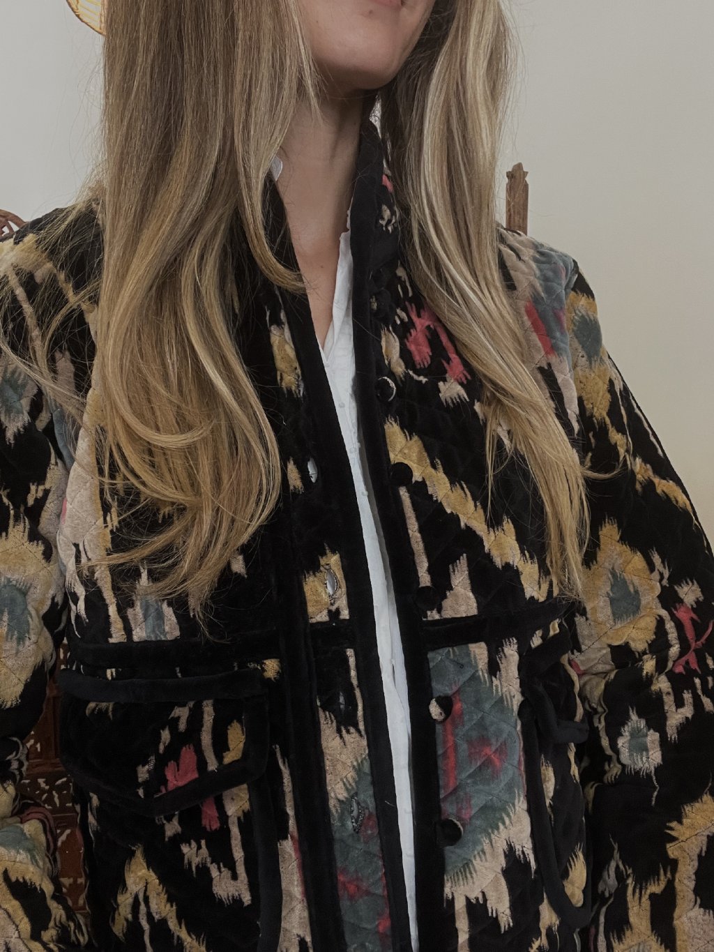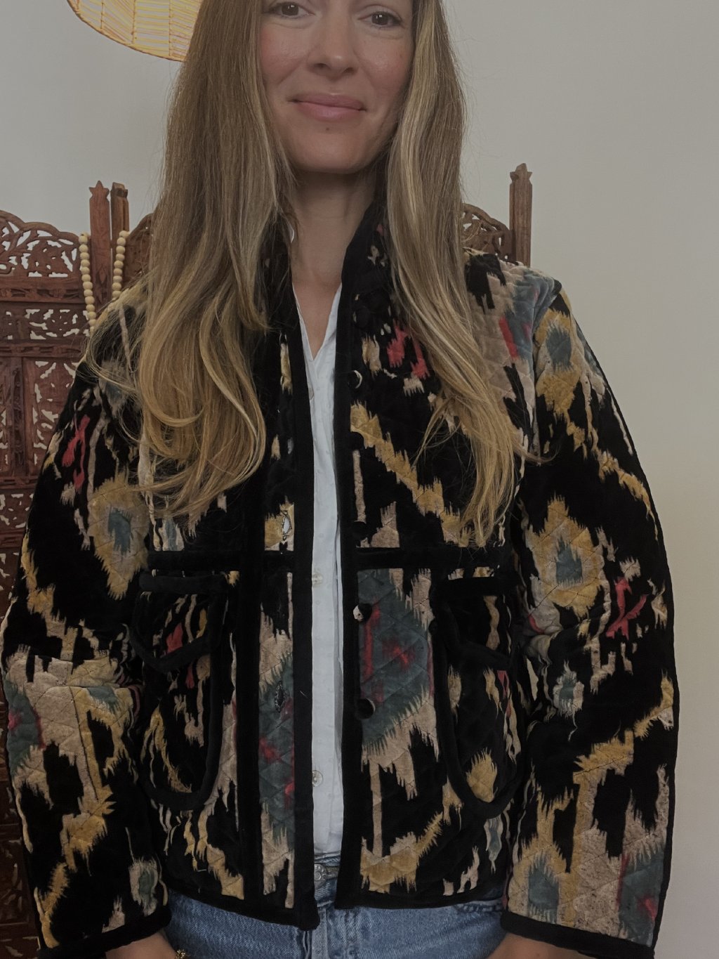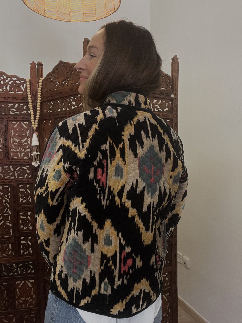 Originální sametový kabátek navržený v České republice a ušitý v Indii. Každý detail byl vytvořen s důrazem na styl, pohodlí a jedinečnost.