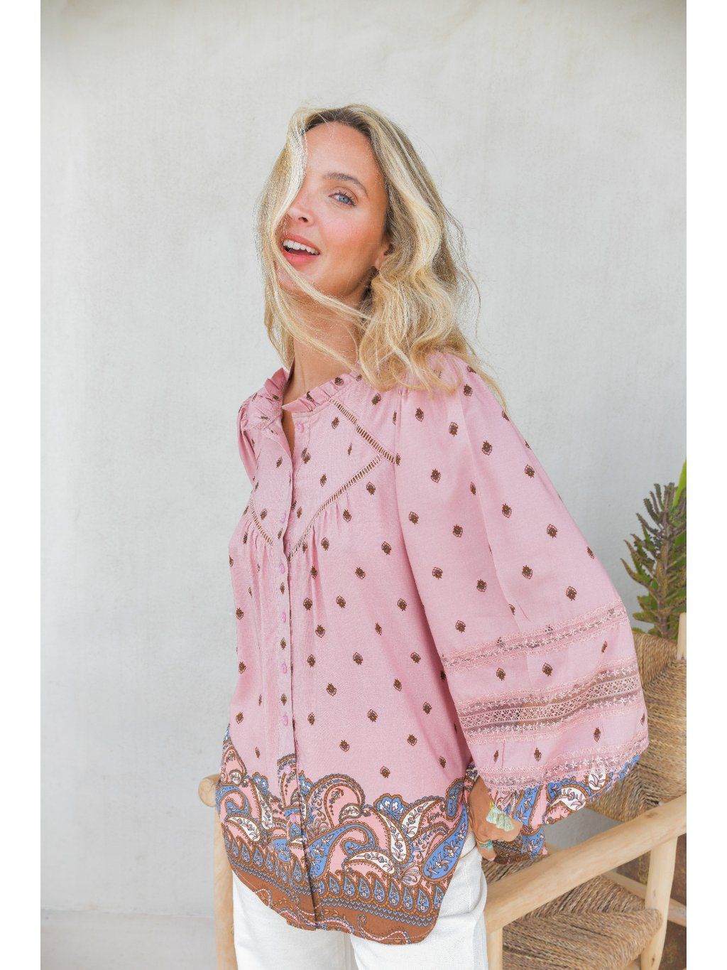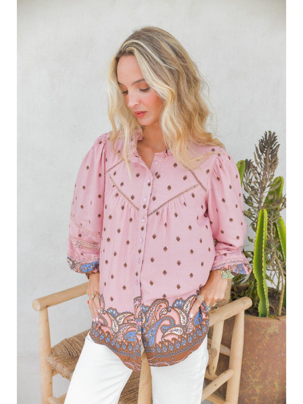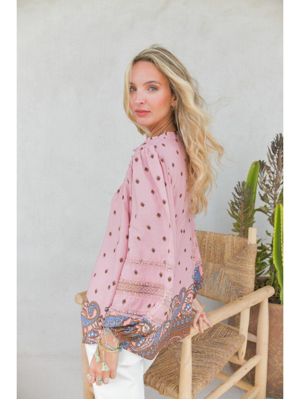 Lehká, vzdušná halenka v jemném pudrově růžovém odstínu s drobným ornamentálním vzorem a výraznou dekorativní bordurou v dolní části. Působí něžně, romanticky a zároveň velmi stylově.