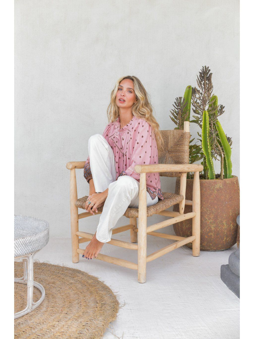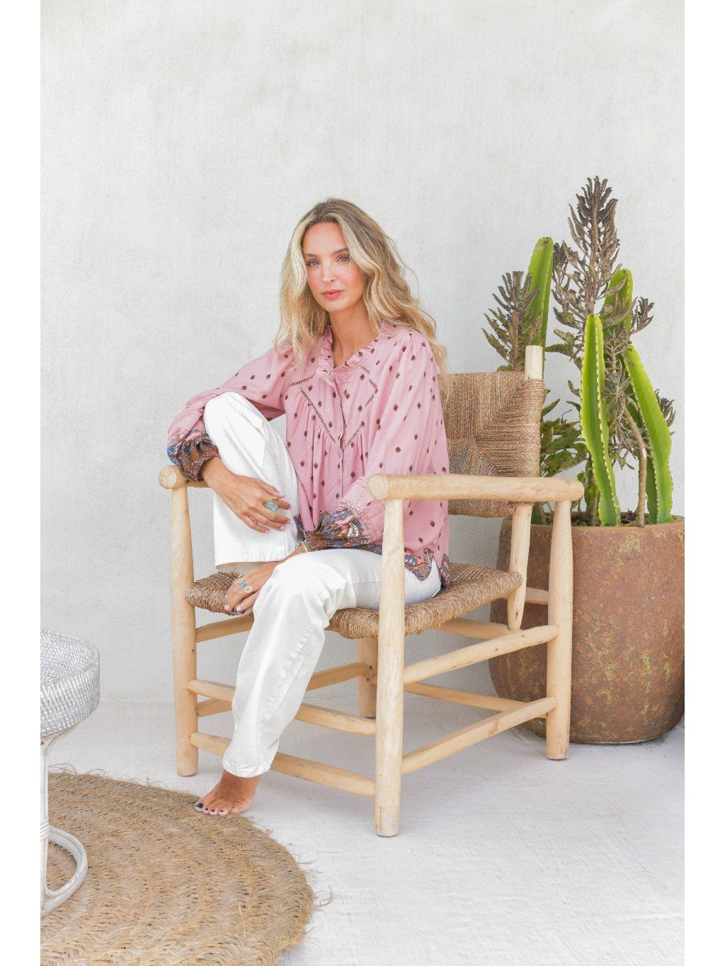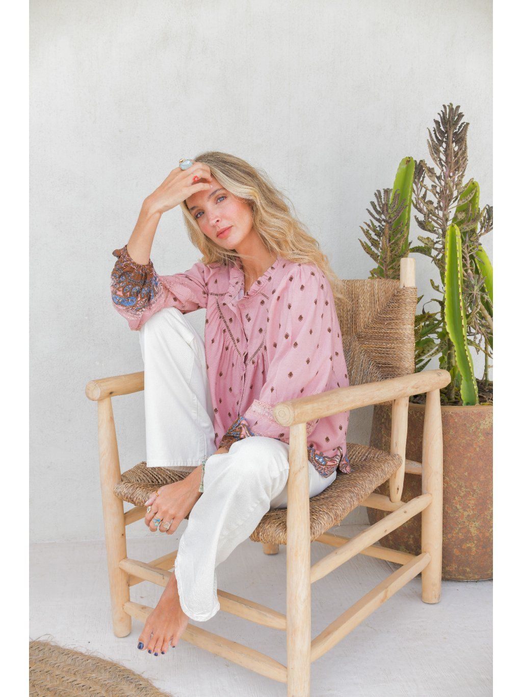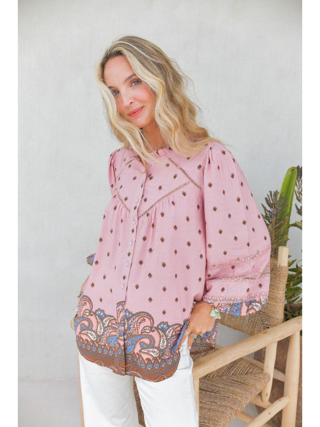Lehká, vzdušná halenka v jemném pudrově růžovém odstínu s drobným ornamentálním vzorem a výraznou dekorativní bordurou v dolní části. Působí něžně, romanticky a zároveň velmi stylově.
