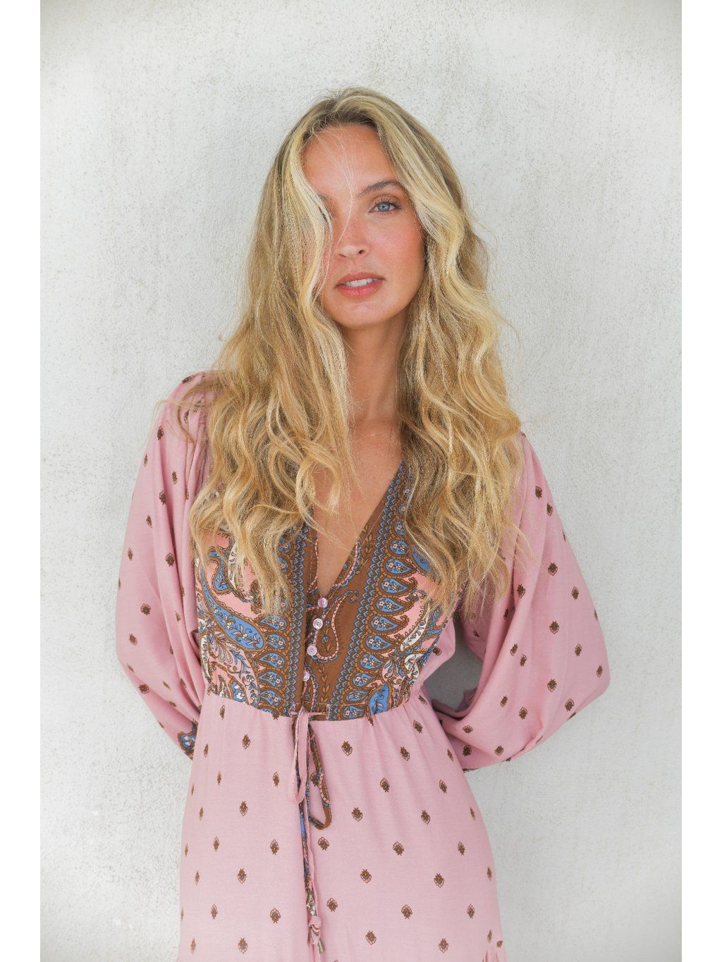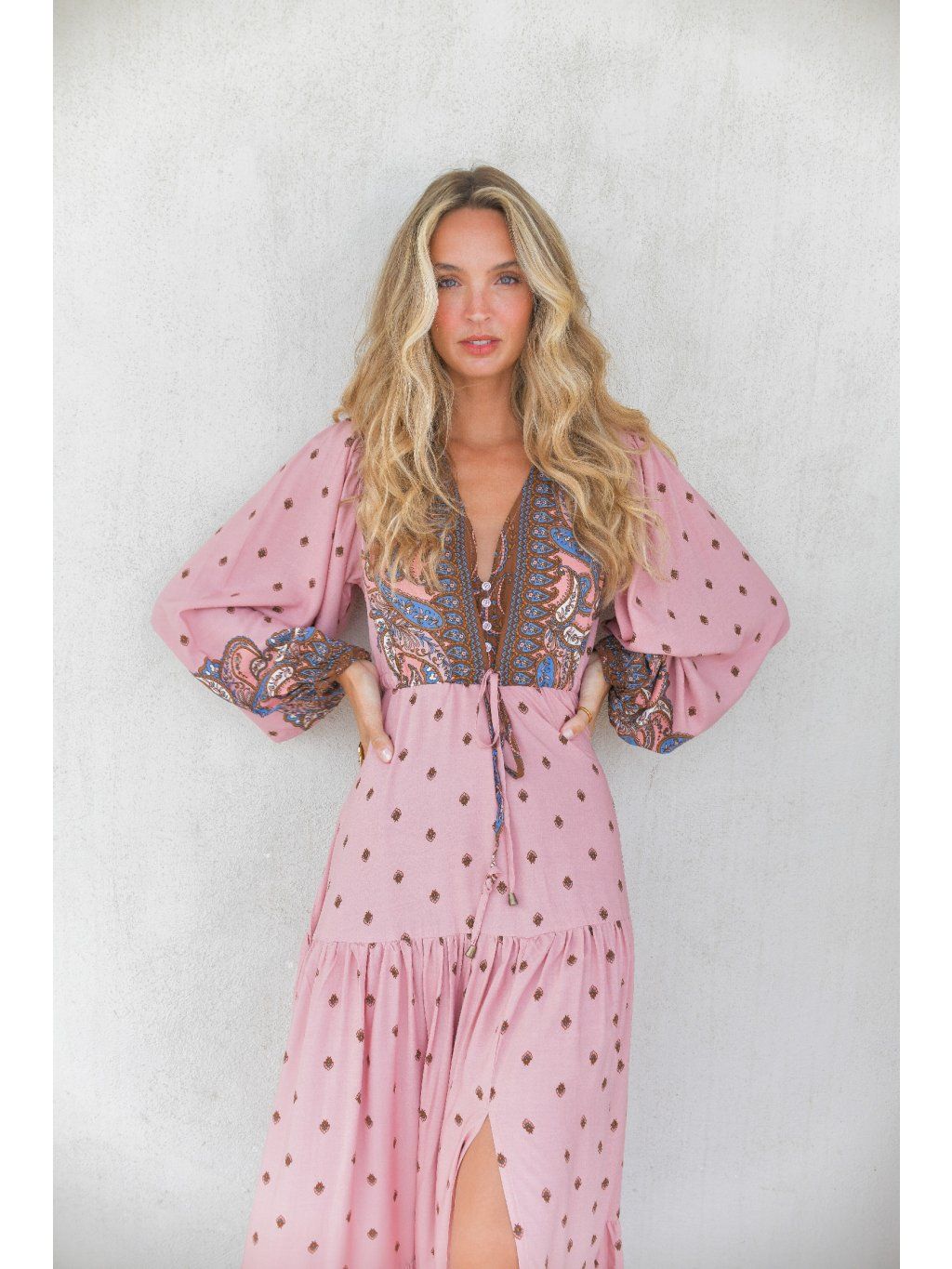 Šaty mají balónové rukávy zakončené do gumičky, které dodávají celému modelu boho nádech a lehkost. Sukně je volně splývavá, doplněná o jemné řasení a rozparek ke kolenům, který působí žensky a zároveň prakticky při chůzi.