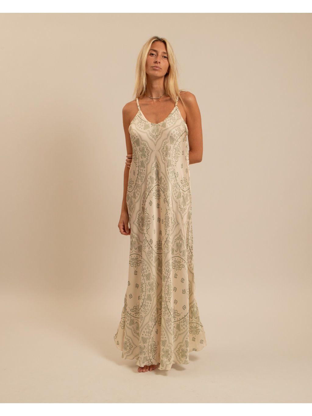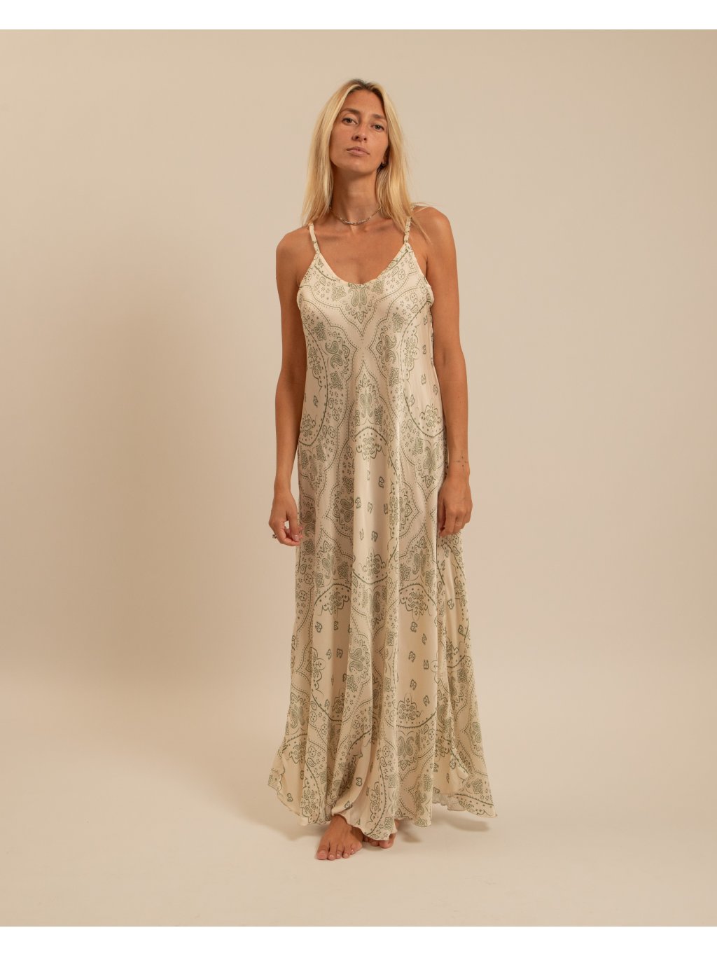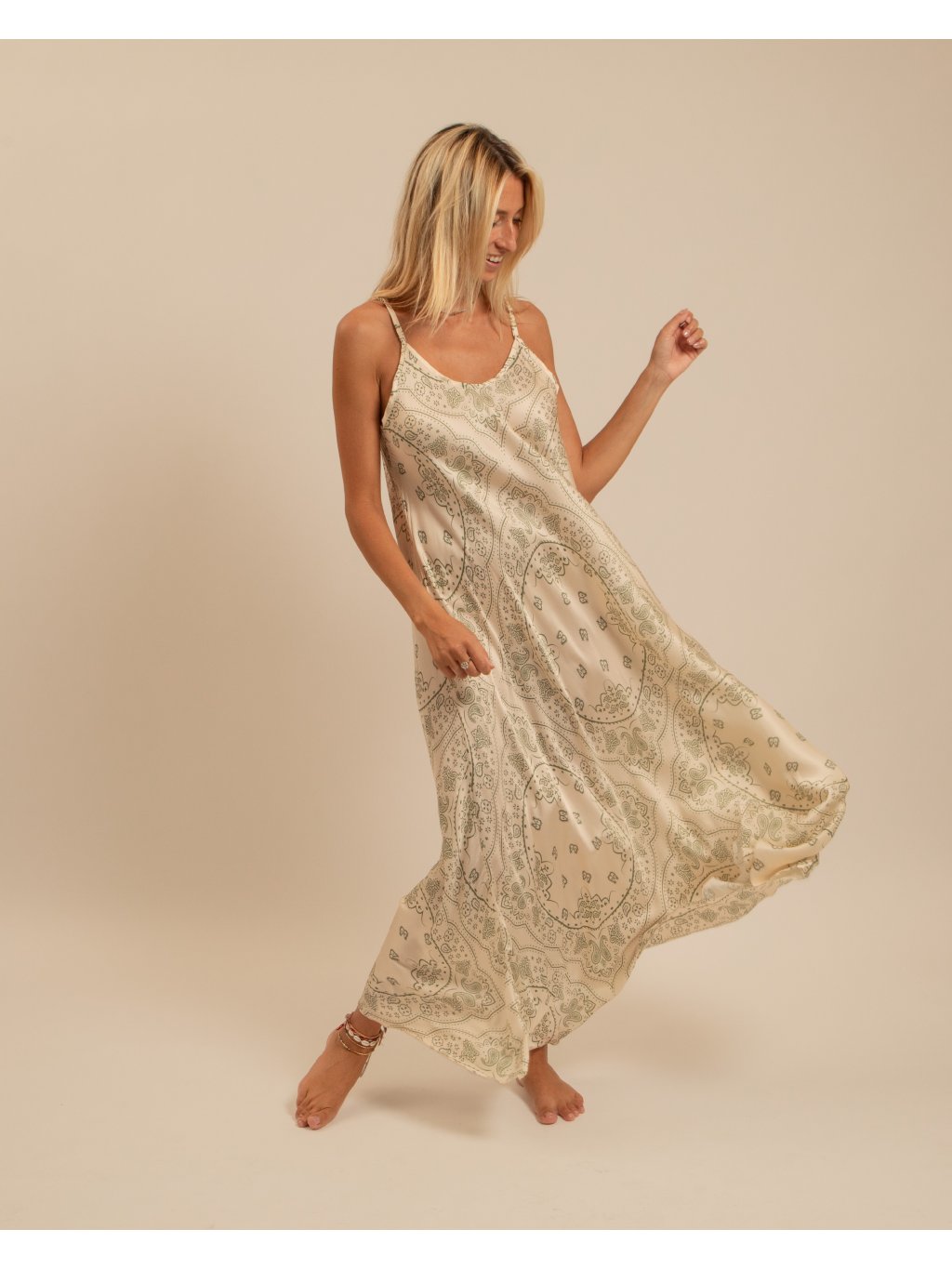 Lehké, splývavé a přirozeně elegantní. Tyto krémové šaty z 100% viskózy zaujmou jemným bandana vzorem, který dodává modelu boho nádech a zároveň zůstává nadčasový. Materiál je velmi příjemný na těle, chladivý a ideální pro teplé letní dny.