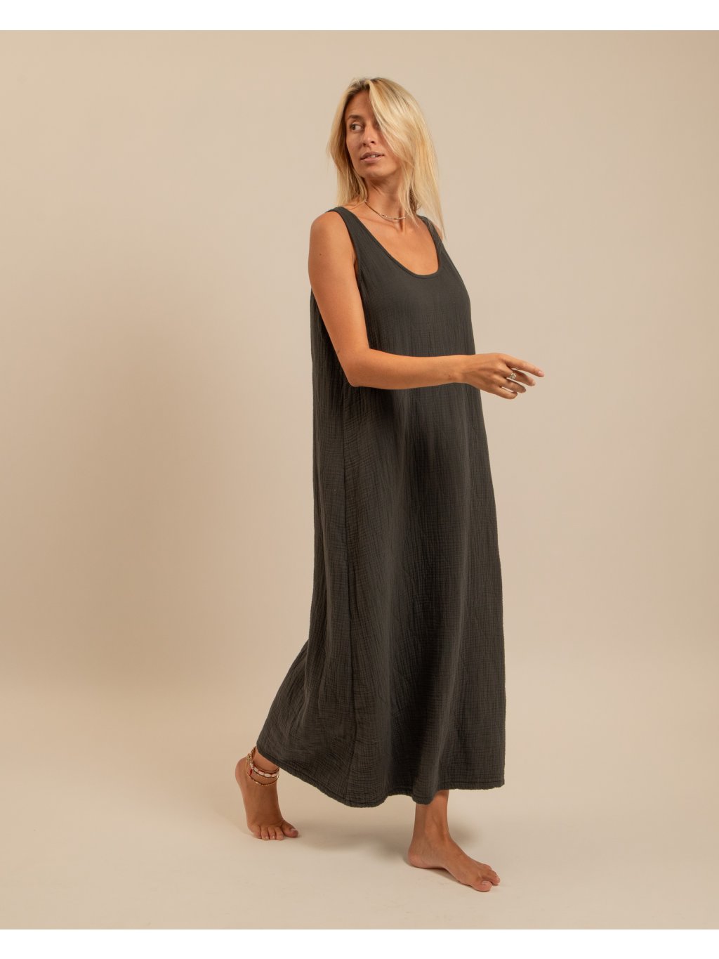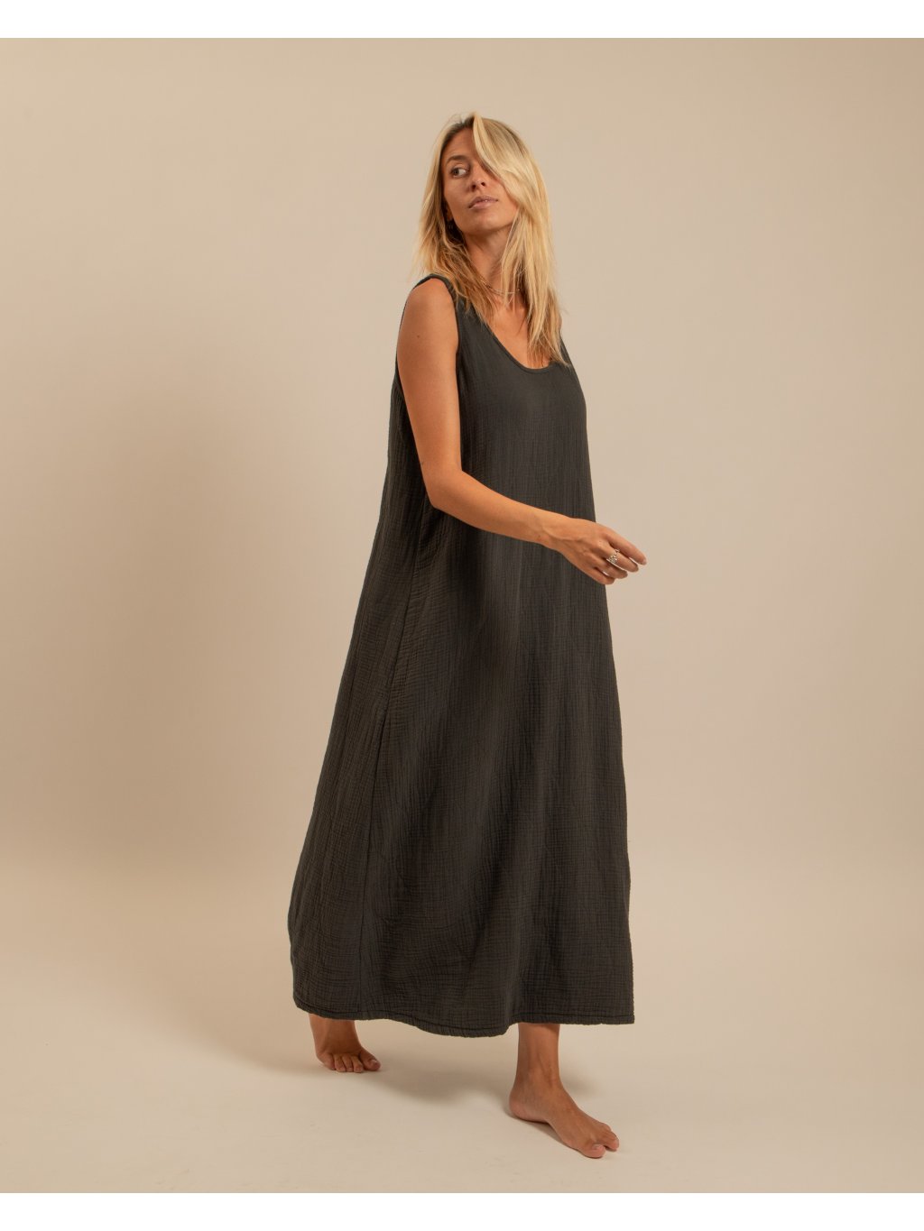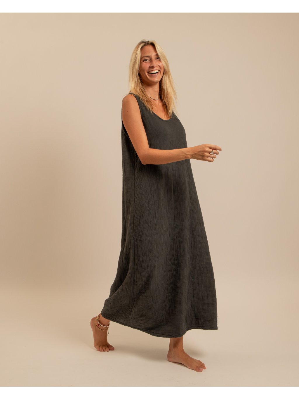 Díky své jednoduchosti se šaty snadno kombinují – hodí se jak na běžné nošení, tak na dovolenou či letní večer. Nadčasová antracitová barva podtrhuje přirozenost materiálu a dodává šatům čistý, sofistikovaný vzhled.