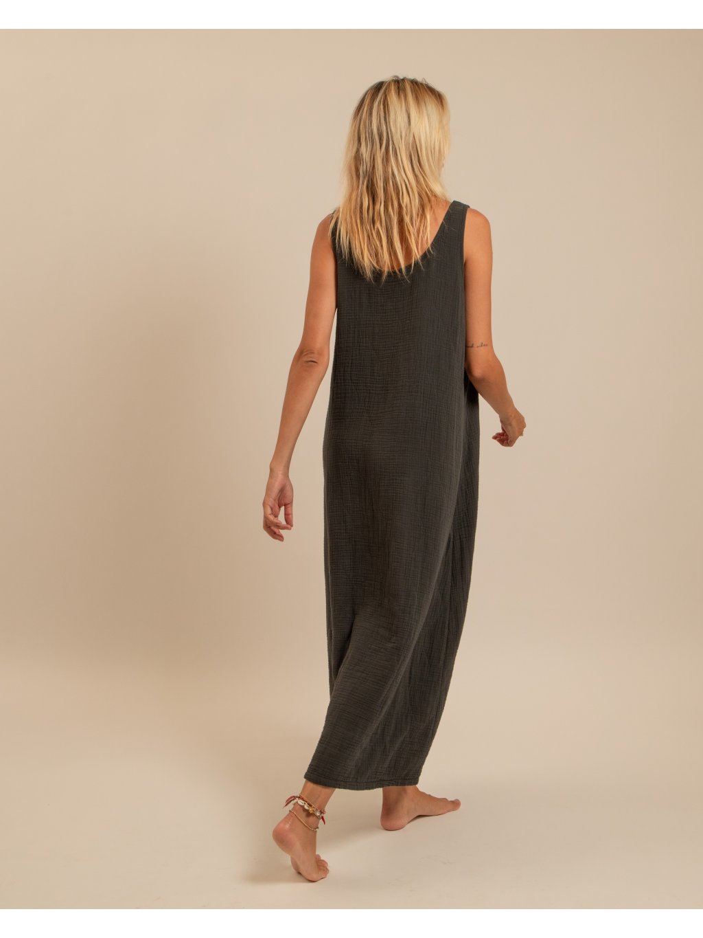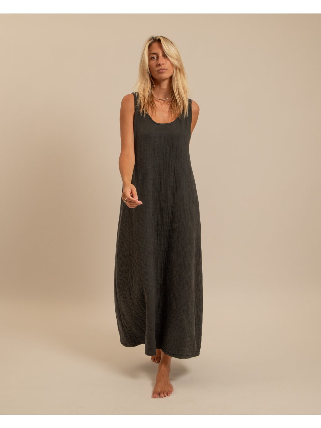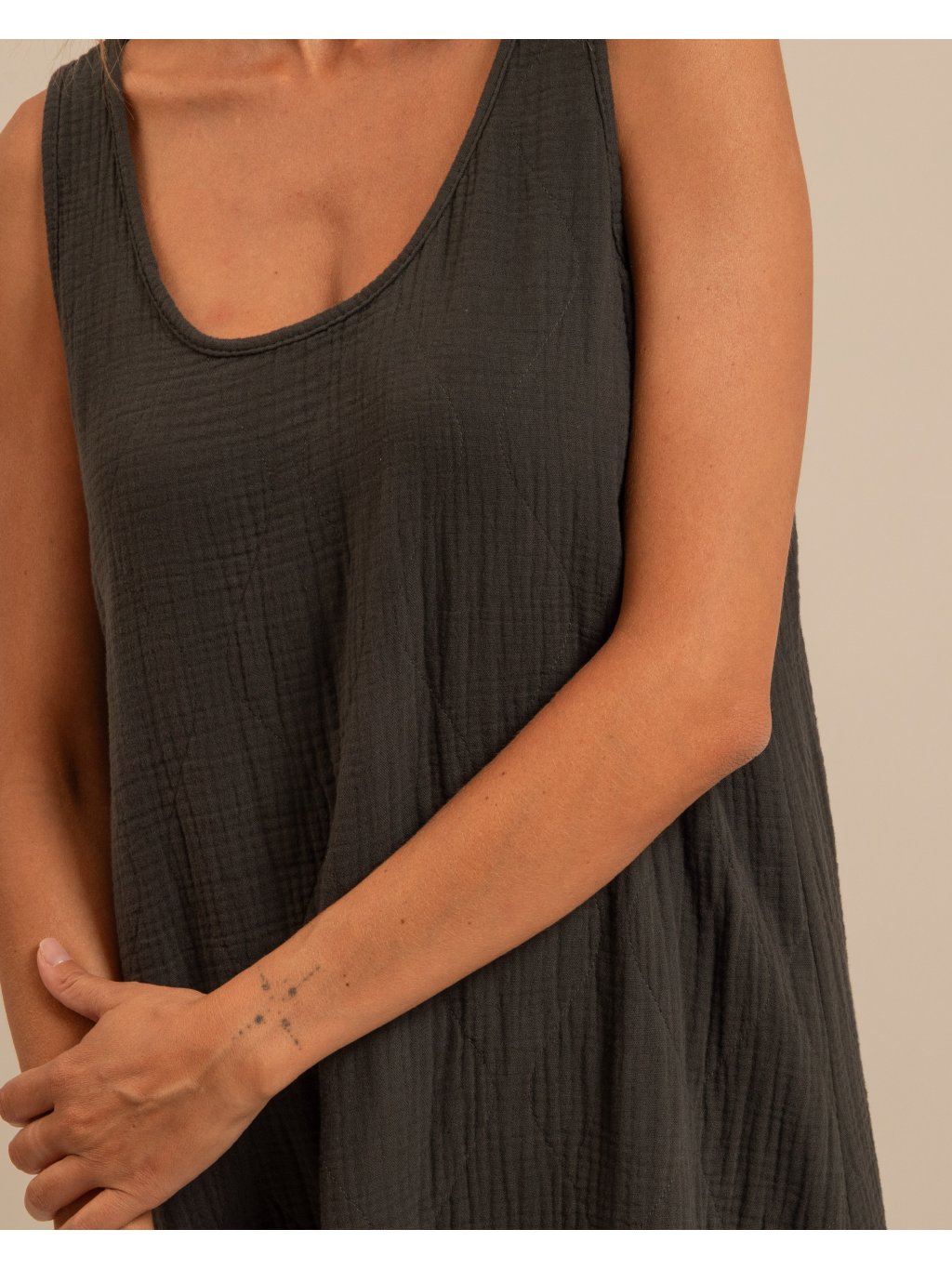 Díky své jednoduchosti se šaty snadno kombinují – hodí se jak na běžné nošení, tak na dovolenou či letní večer. Nadčasová antracitová barva podtrhuje přirozenost materiálu a dodává šatům čistý, sofistikovaný vzhled.