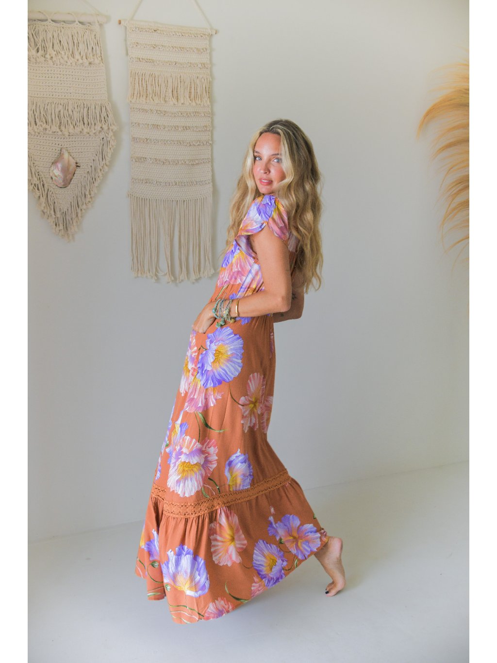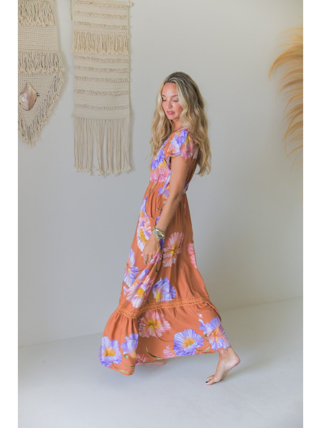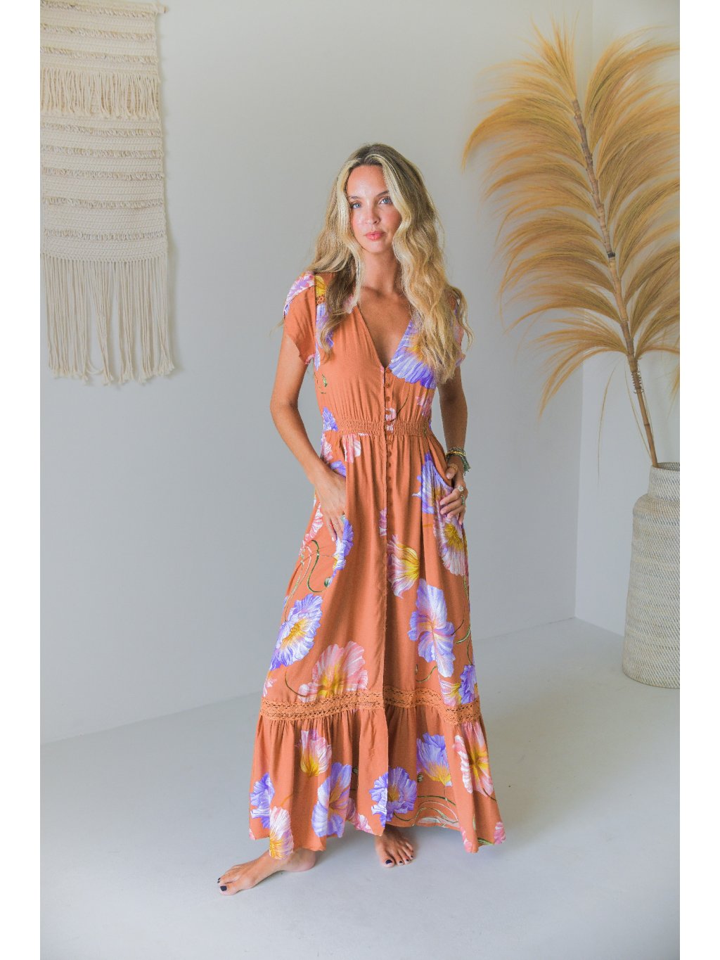 Tyto maxi šaty v bohémském duchu zaujmou na první pohled svým teplým meruňkovo-terakotovým odstínem, který je doplněn výrazným květinovým potiskem v tónech levandulové, růžové a jemně žluté. Působí svěže, žensky a zároveň velmi přirozeně.