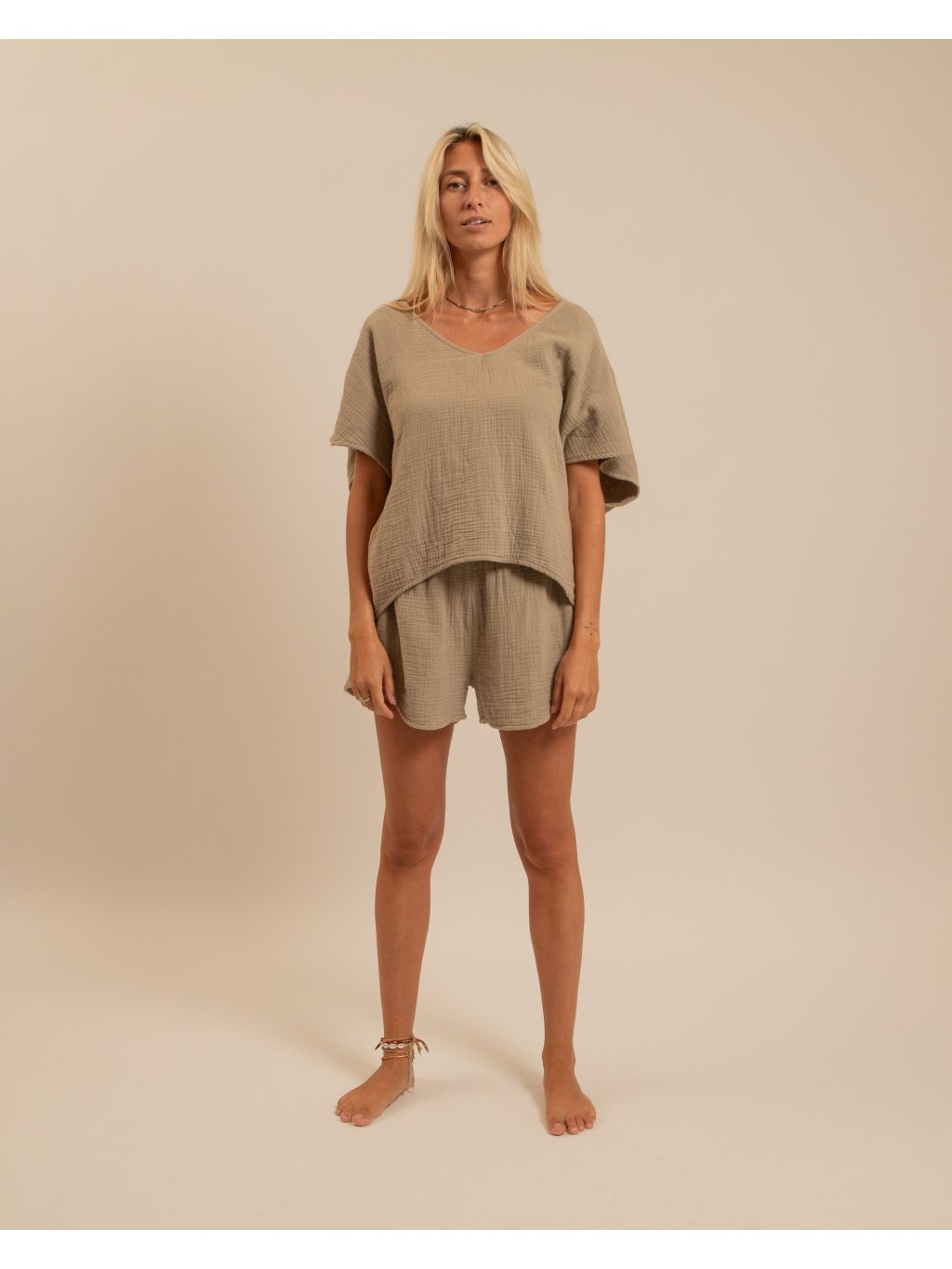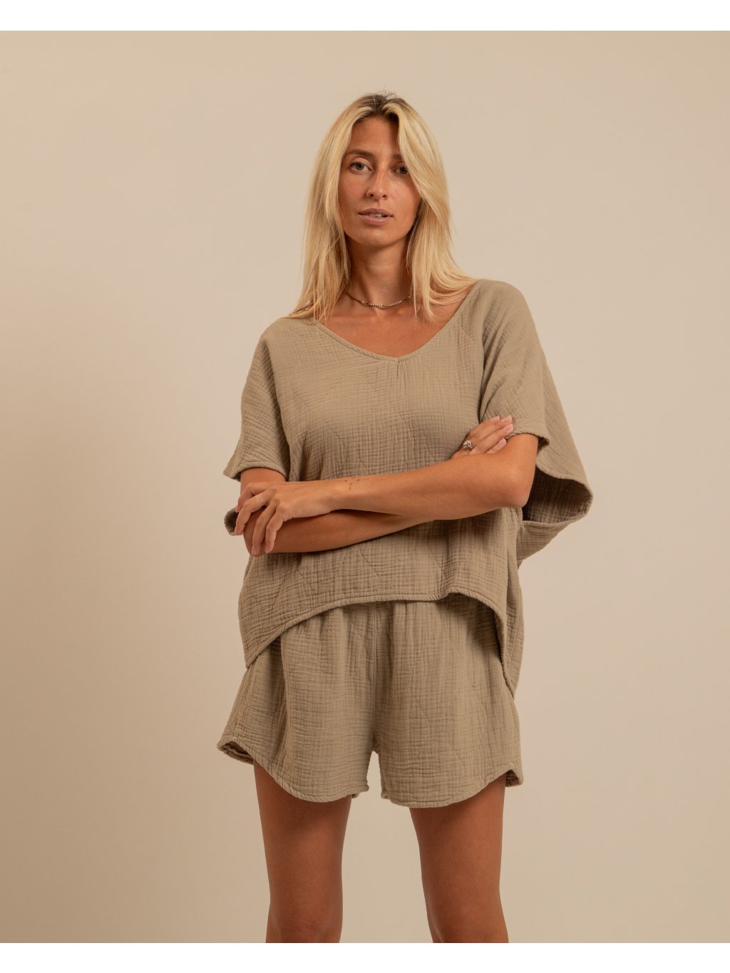 Lehké béžové tričko z dvojitého mušelínu je dokonalou volbou pro milovnice minimalistického a přirozeného stylu. Jemná struktura látky dodává tričku zajímavý vzhled, zatímco prodyšný bavlněný materiál zajišťuje maximální komfort i v horkých dnech.