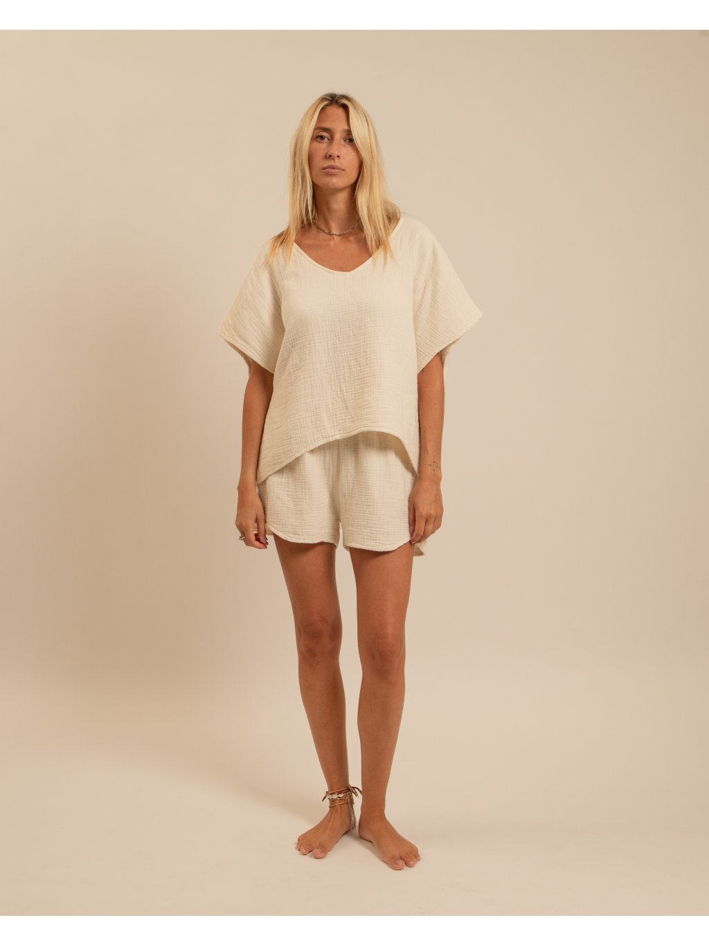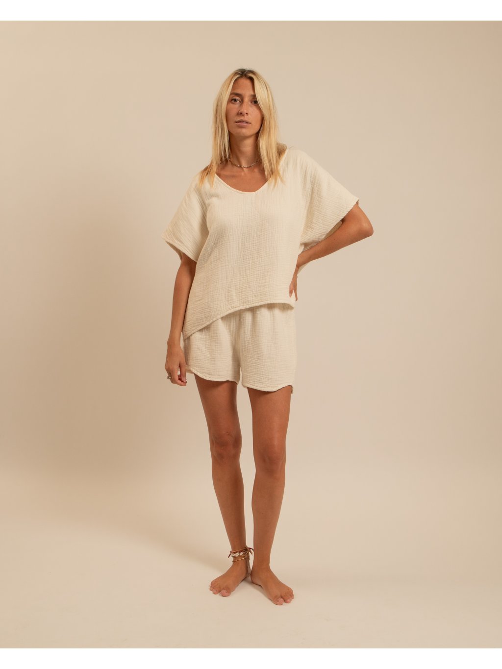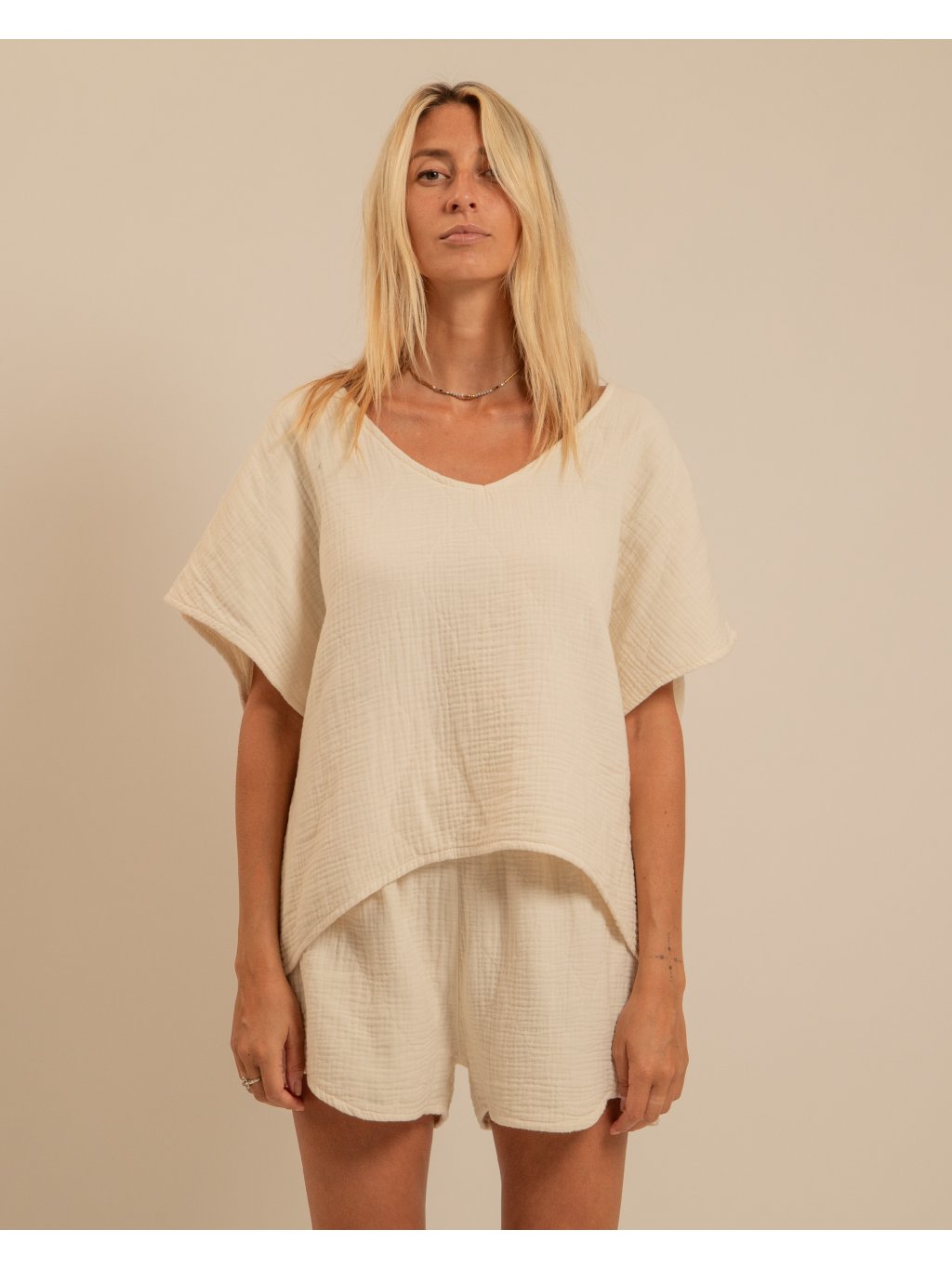 Volný střih s krátkým rukávem a decentním výstřihem působí nenuceně a elegantně zároveň. Krémová barva podtrhuje čistotu designu a nabízí nekonečné možnosti kombinování – od sladěného setu až po kontrastní letní outfit.