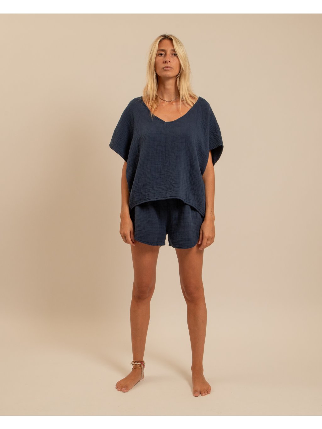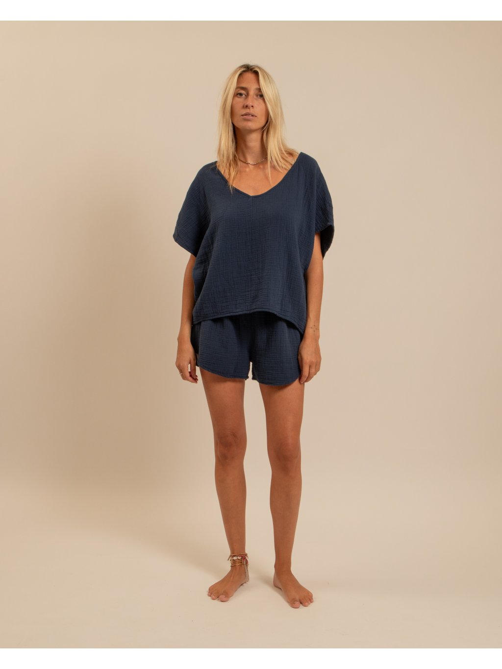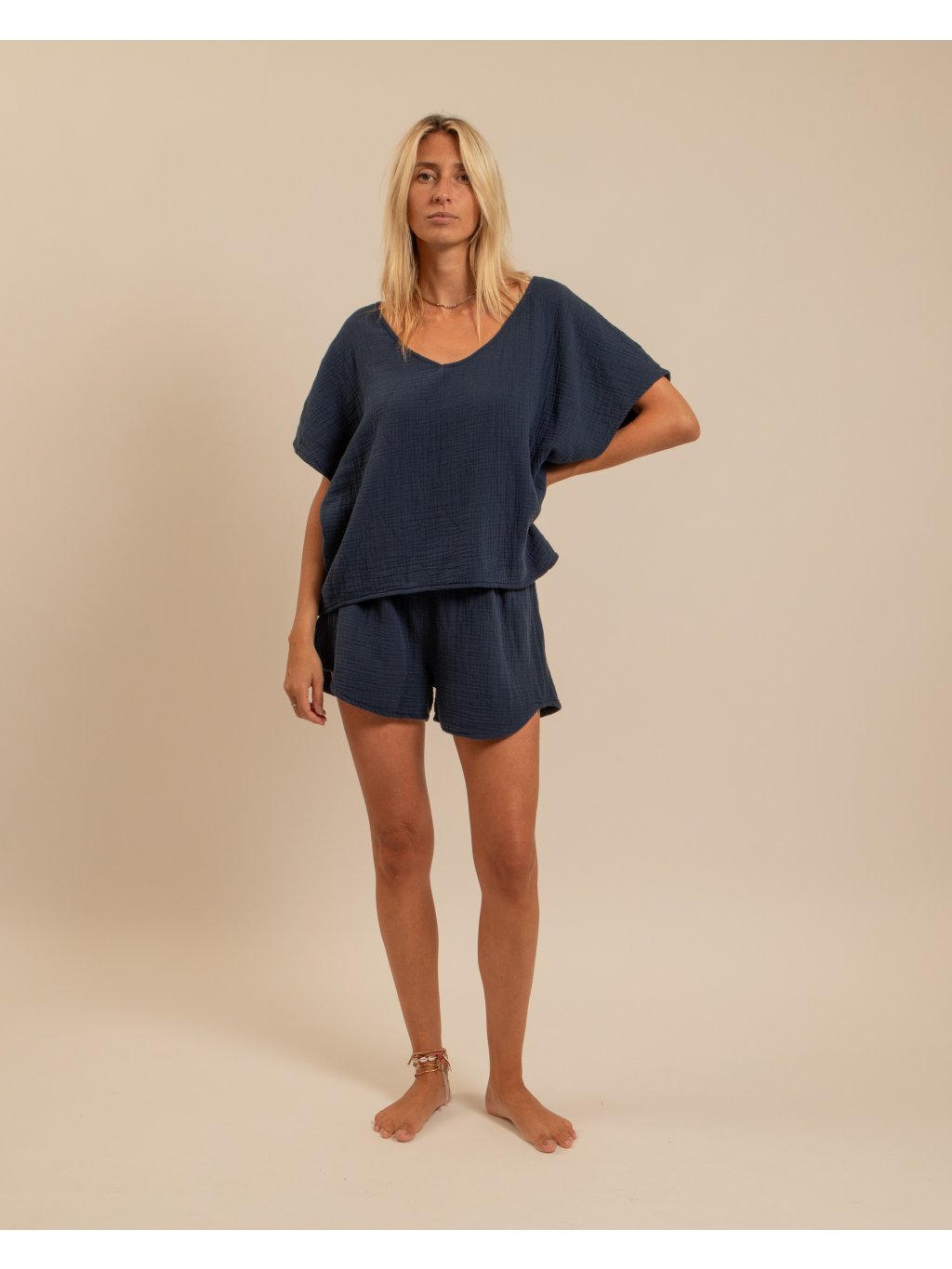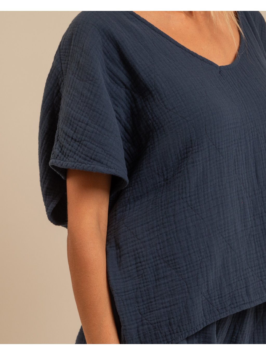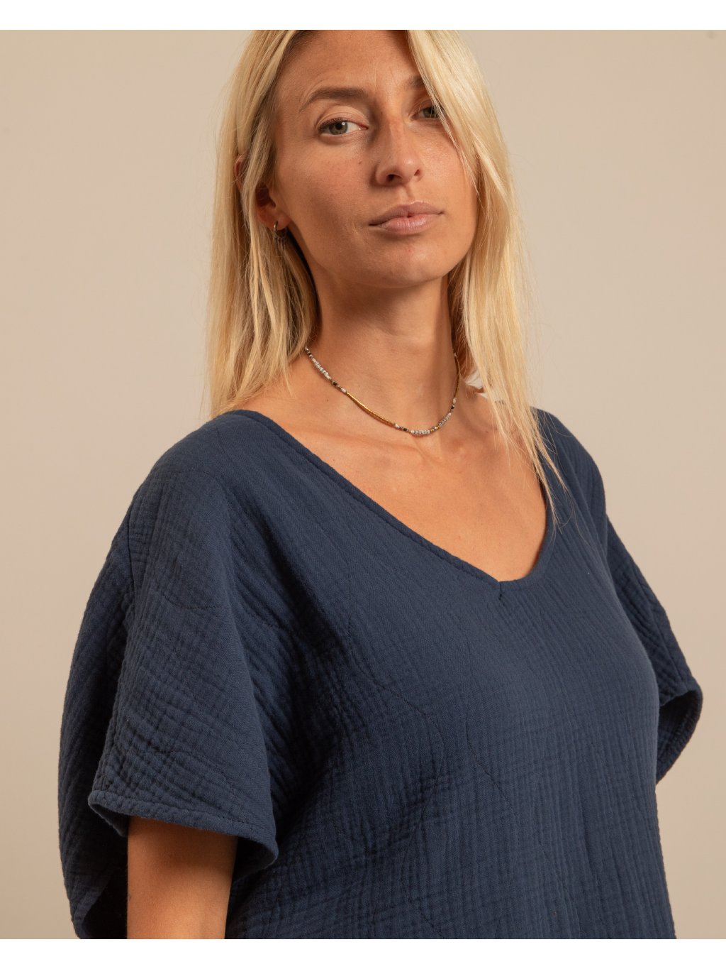 Lehké tričko z dvojitého mušelínu je dokonalou volbou pro milovnice minimalistického a přirozeného stylu. Jemná struktura látky dodává tričku zajímavý vzhled, zatímco prodyšný bavlněný materiál zajišťuje maximální komfort i v horkých dnech.