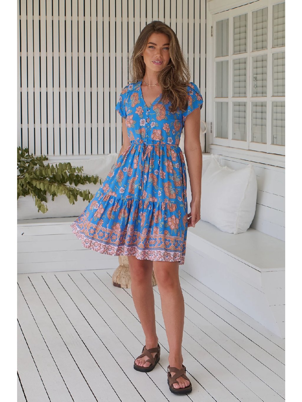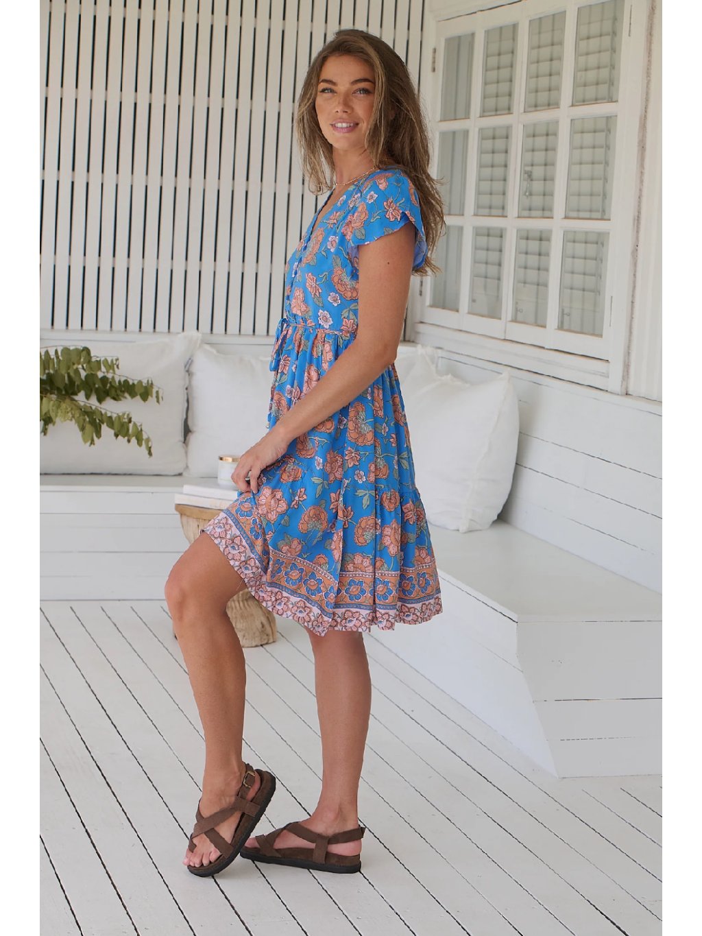 Romantické letní šaty s jemným květinovým potiskem v teplých zemitých tónech jsou ideální volbou pro každodenní nošení i volné letní dny. Mají výstřih do V, knoflíčky v horní části a volně uvázaný látkový pásek, kterým si snadno zvýrazníte siluetu. Lehká, vzdušná sukně s volánem dodává šatům šmrnc i pohodlí. Vyrobené z příjemného rayonu, který krásně splývá a nosí se jedna radost.
