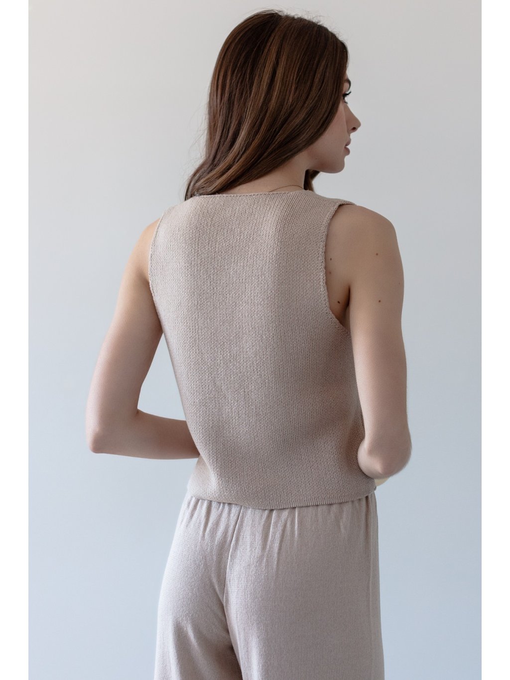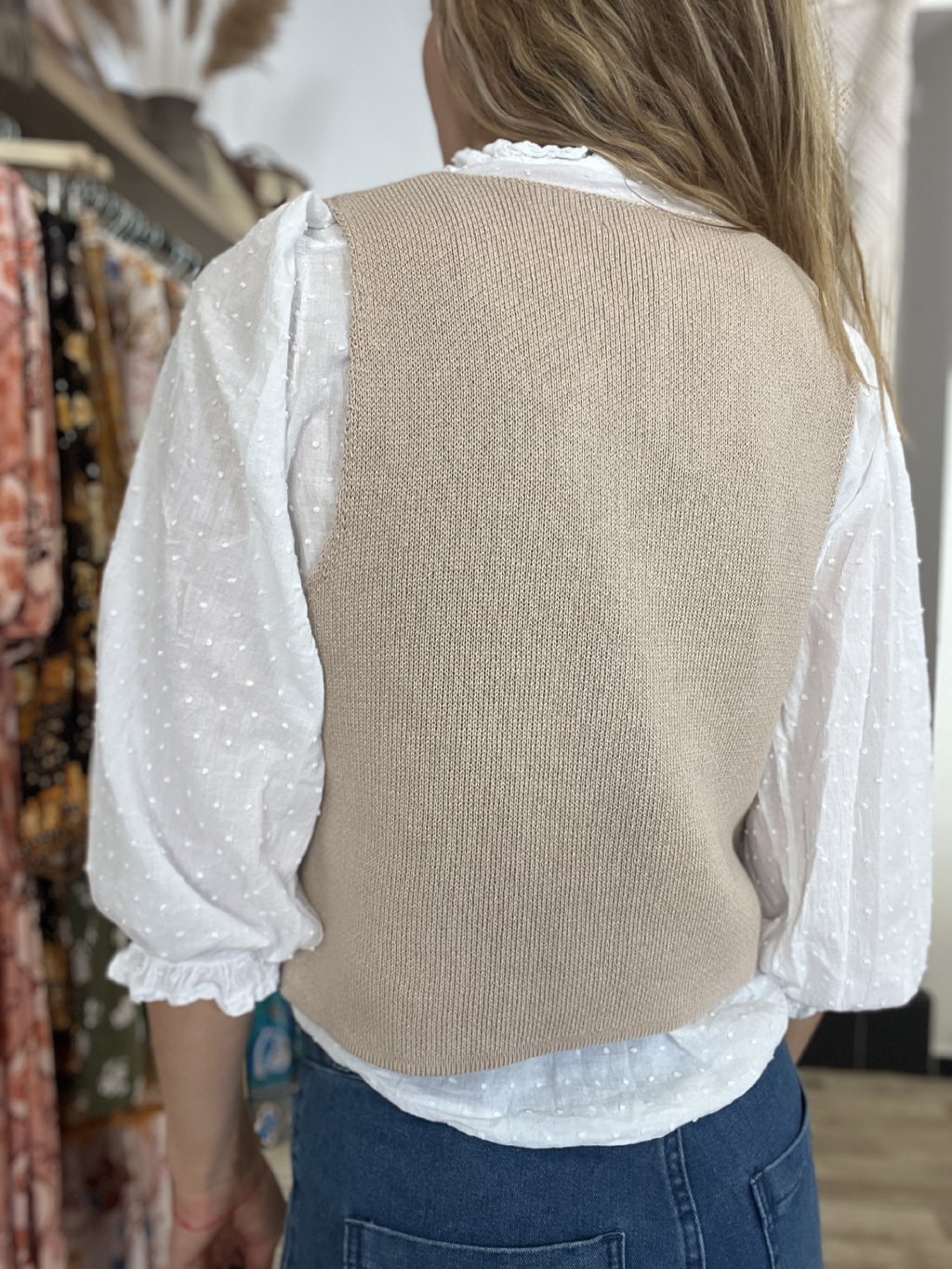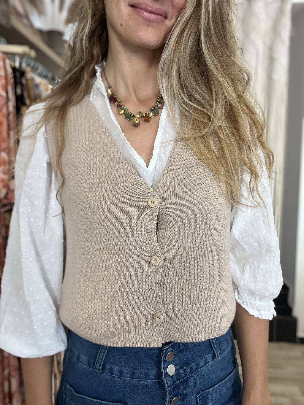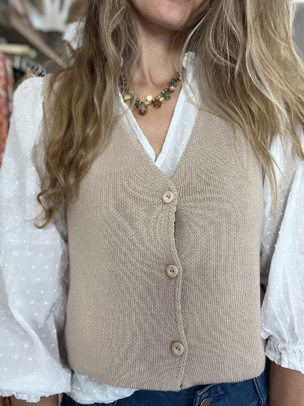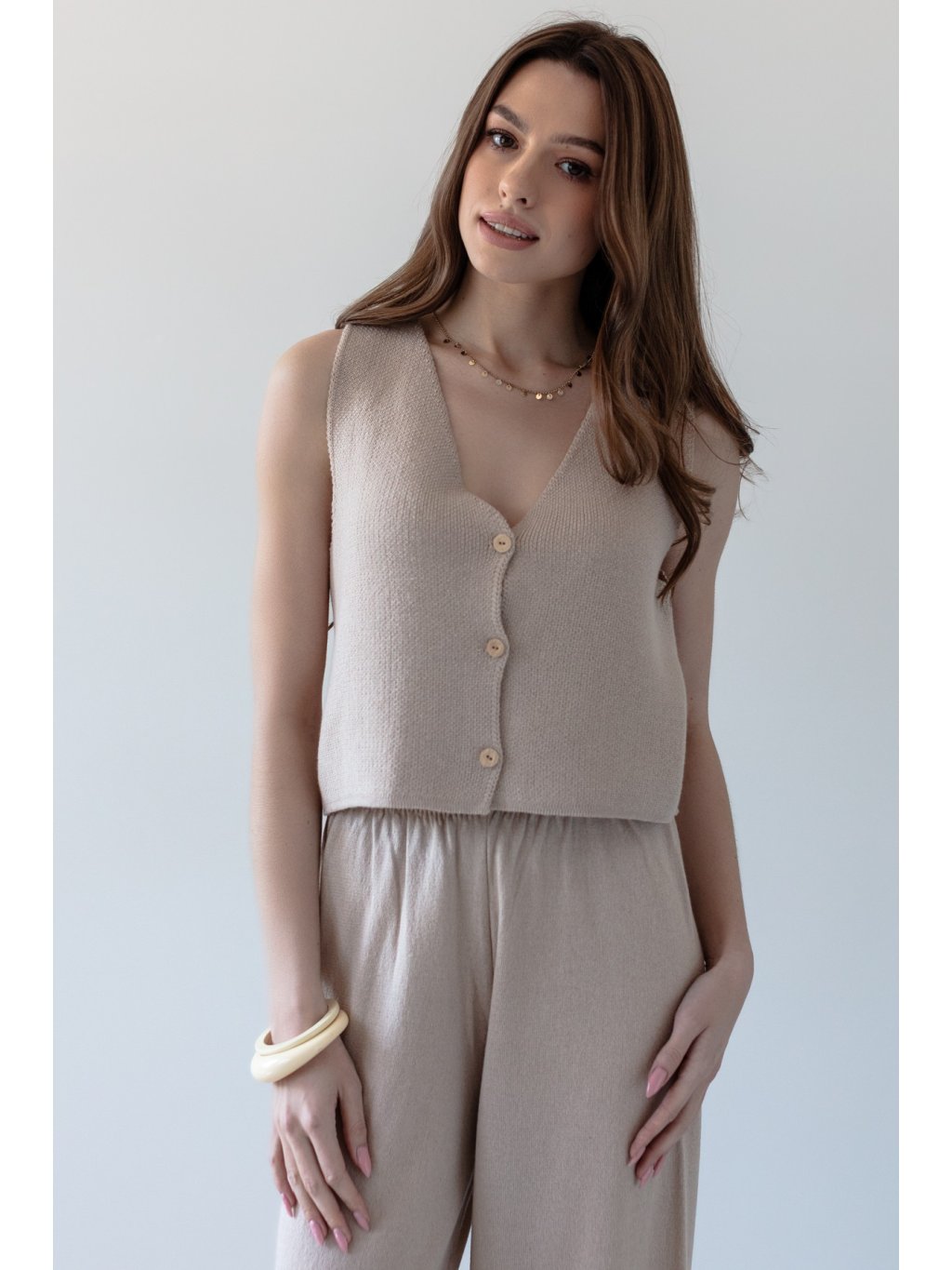 Elegantní pletená vesta v jemném béžovém odstínu, vyrobená z luxusní směsi organické bavlny a kašmíru. Tento materiál je mimořádně měkký, prodyšný a příjemný na dotek, takže se skvěle nosí po celý den. Vesta má hlubší výstřih do V, zapínání na tři knoflíky a kratší střih, který krásně ladí s kalhotami s vysokým pasem, sukní i šaty.